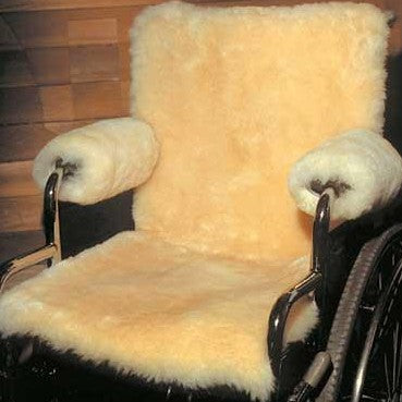 Made from genuine sheepskin. Attach around wheelchair arms with Velcro. Approximately 18 cm x 18 cm (7" x 7"). Machine washable. Priced per pair.