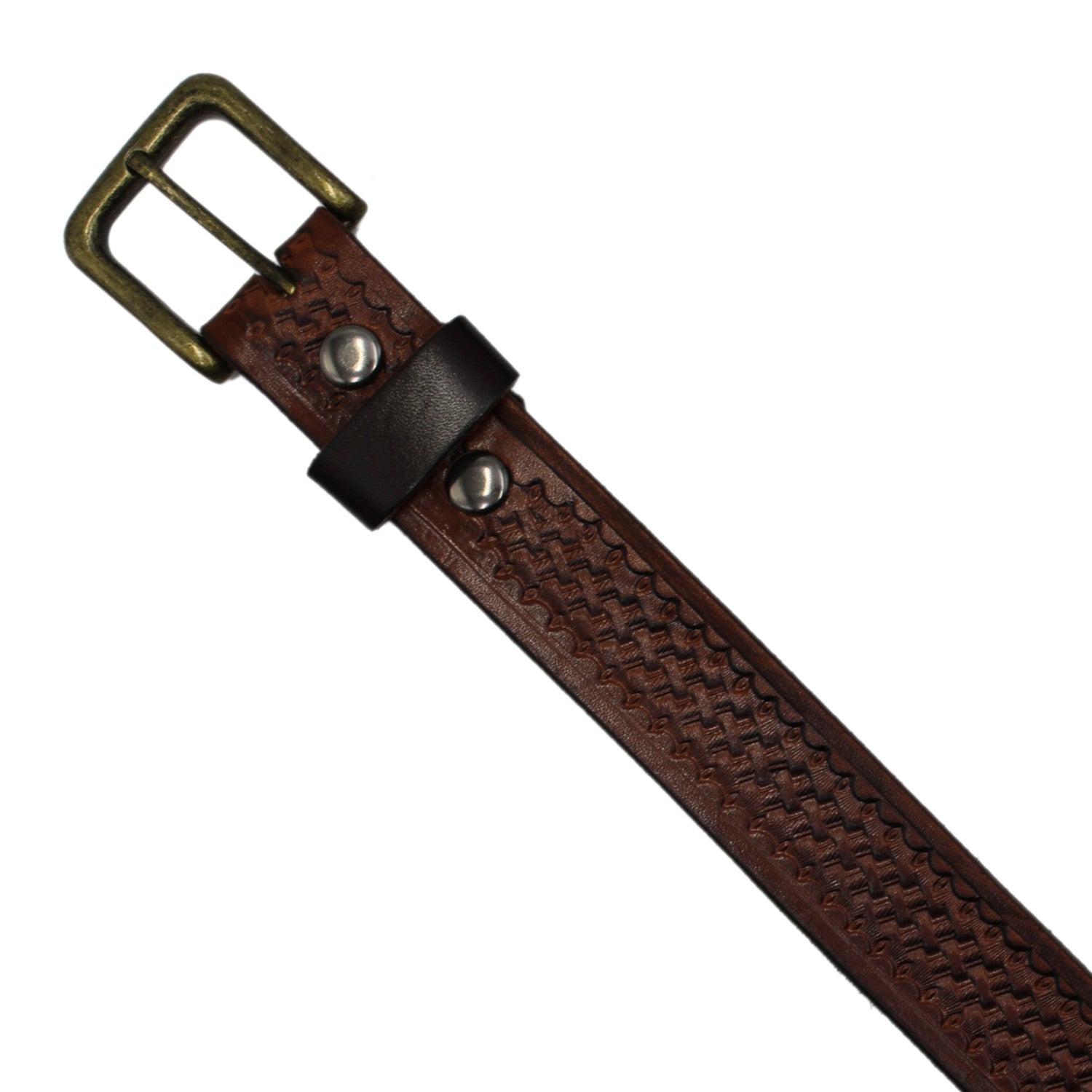 Embossed basketweave on full grain leather with a pin buckle. 3 mm (1 1/4") wide. We recommend ordering a belt size that is 2" larger than your pant size for a proper fit.