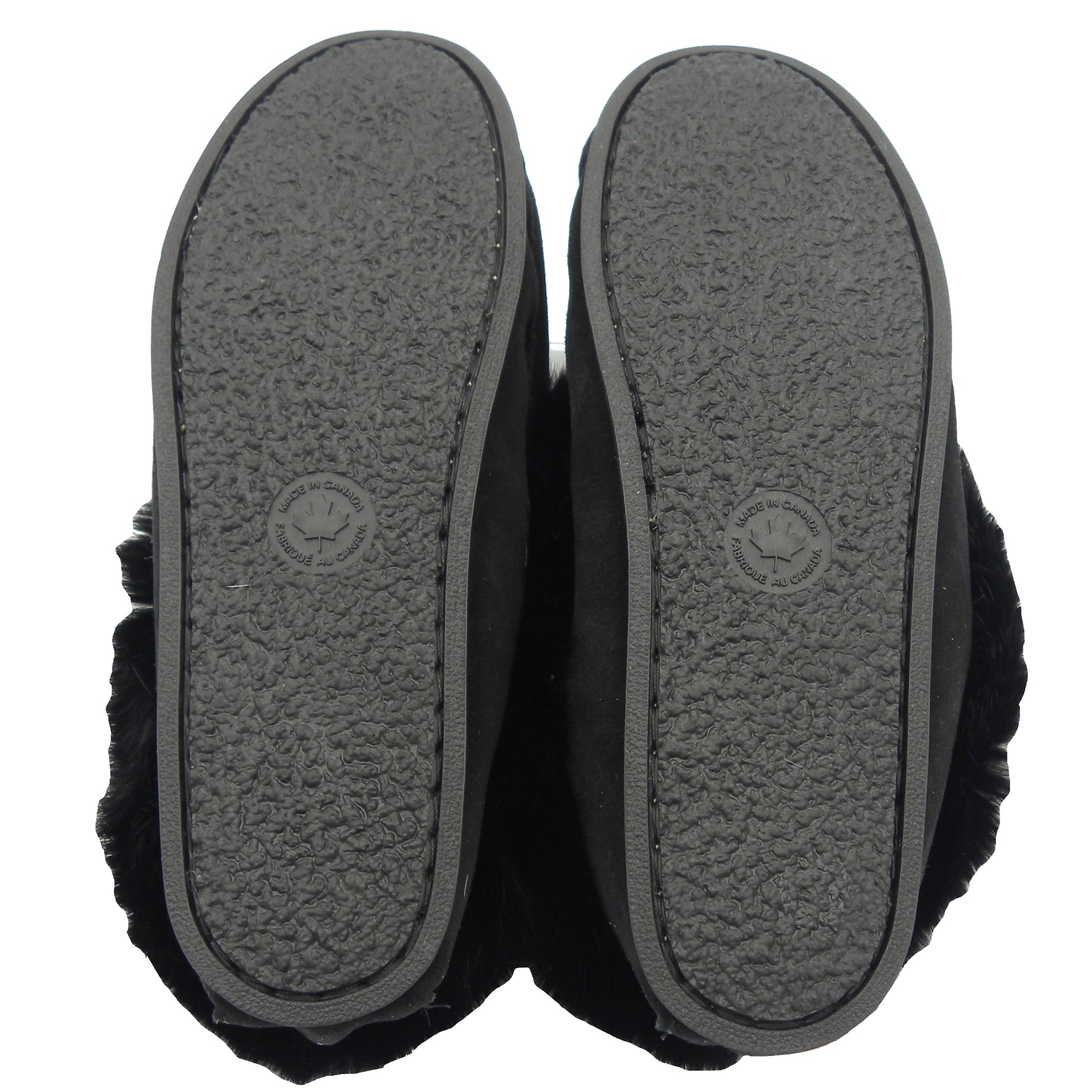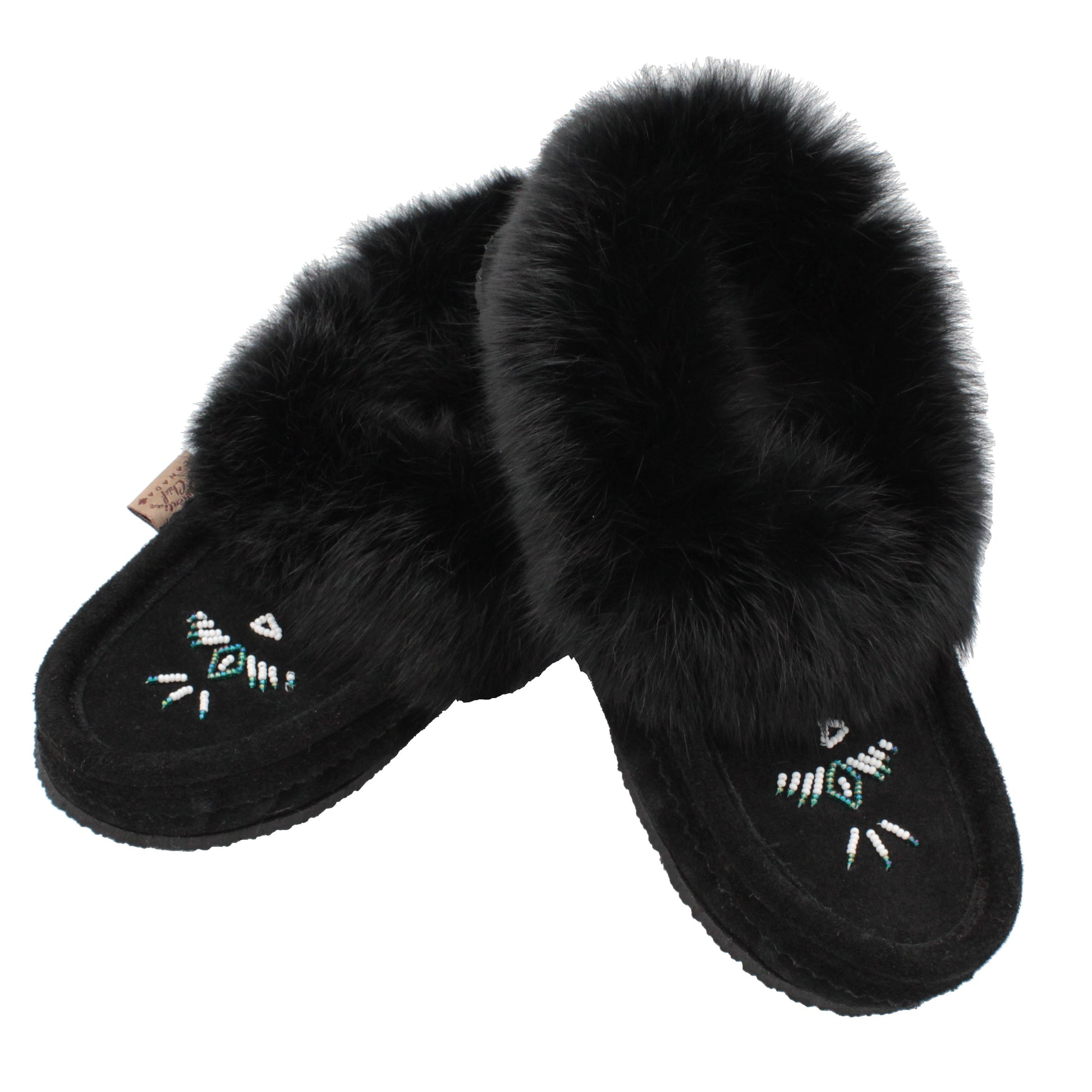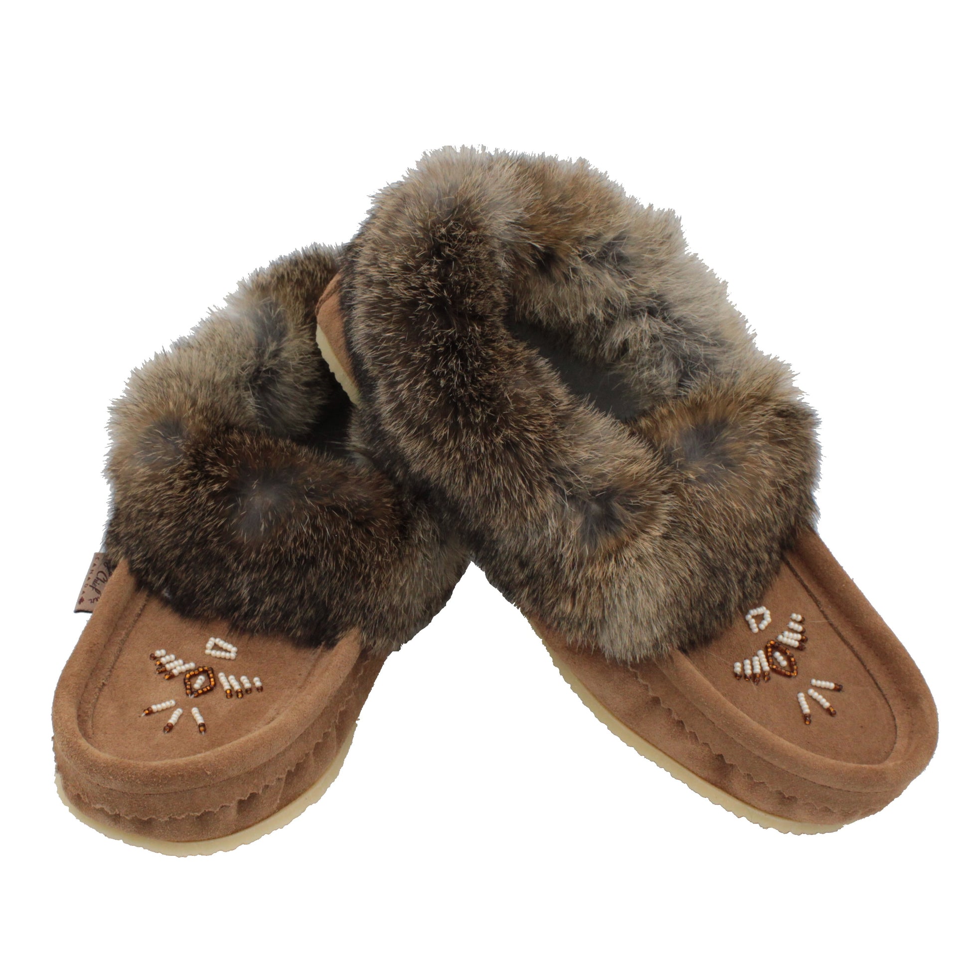 A suede leather moccasin with a non-slip gum sole. Fleece lined with rabbit fur cuffs and decorative beading. Medium width. Rabbit fur colour and beading may vary.