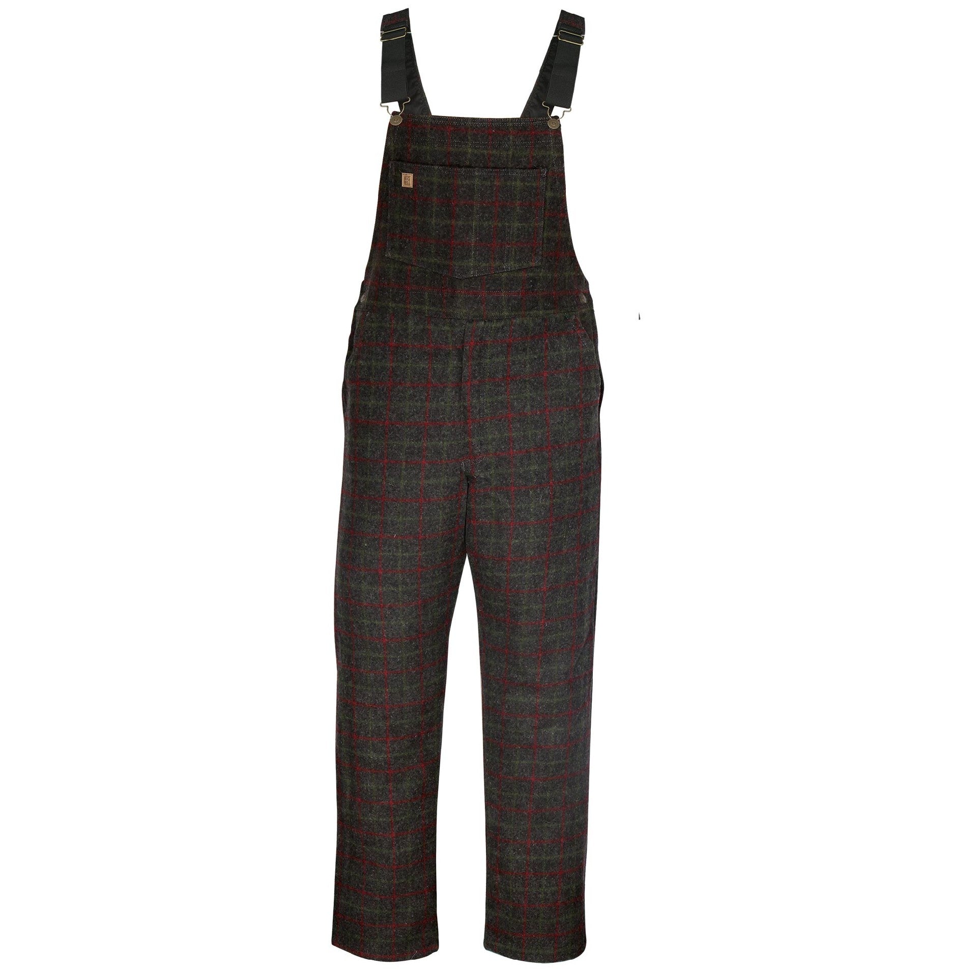 28 oz. 100% wool overalls. Patch bib pocket with four divisions. Two front slash pockets. Two rear patch pockets. Button closure on either side of the waistband for a snug fit and easy entry. Brass front zipper closure. Adjustable elastic suspenders with buckle and button closure. 32" inseam.