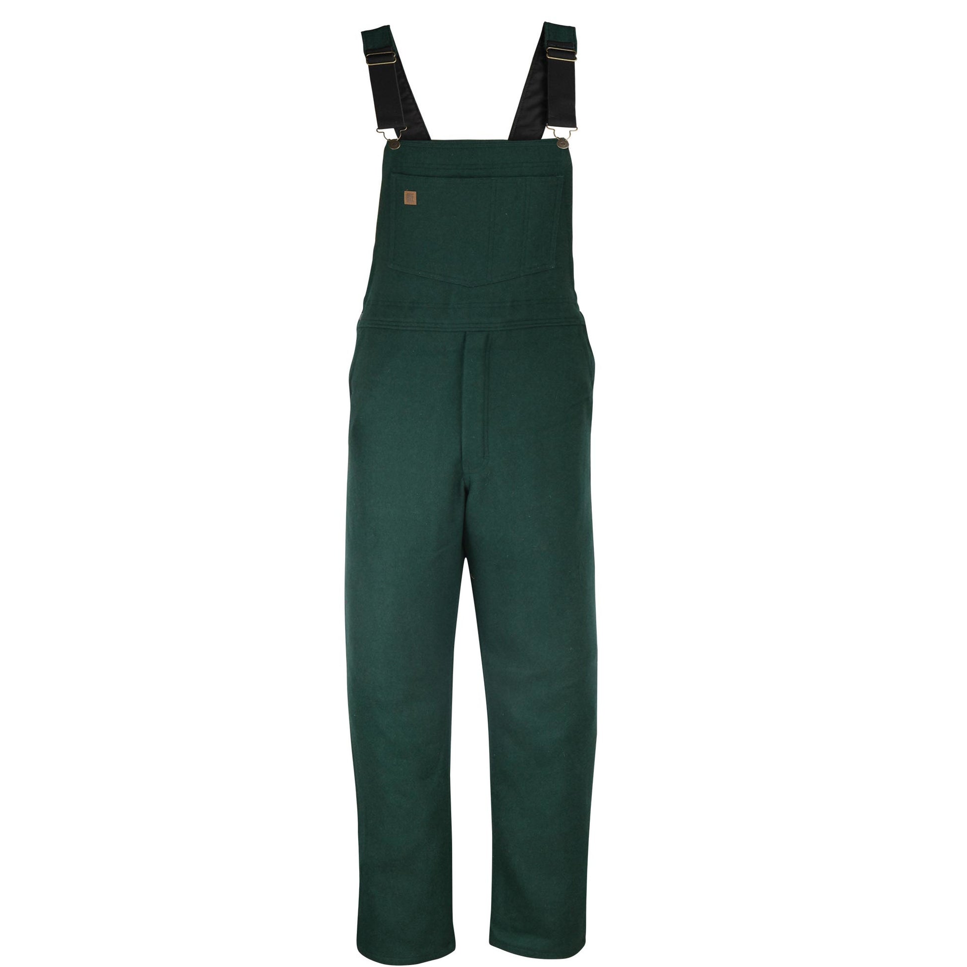 24 oz. 80% wool. Front bib patch pocket, back patch pockets and two front slash pockets. Button side entries, fly front and adjustable elastic shoulder straps allow for comfortable fitting. 32" inseam.