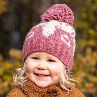 Child's wool toque with ribbed band and solid knit body. Bear jacquard design with wool pompom. Polyester fleece headband lining.
