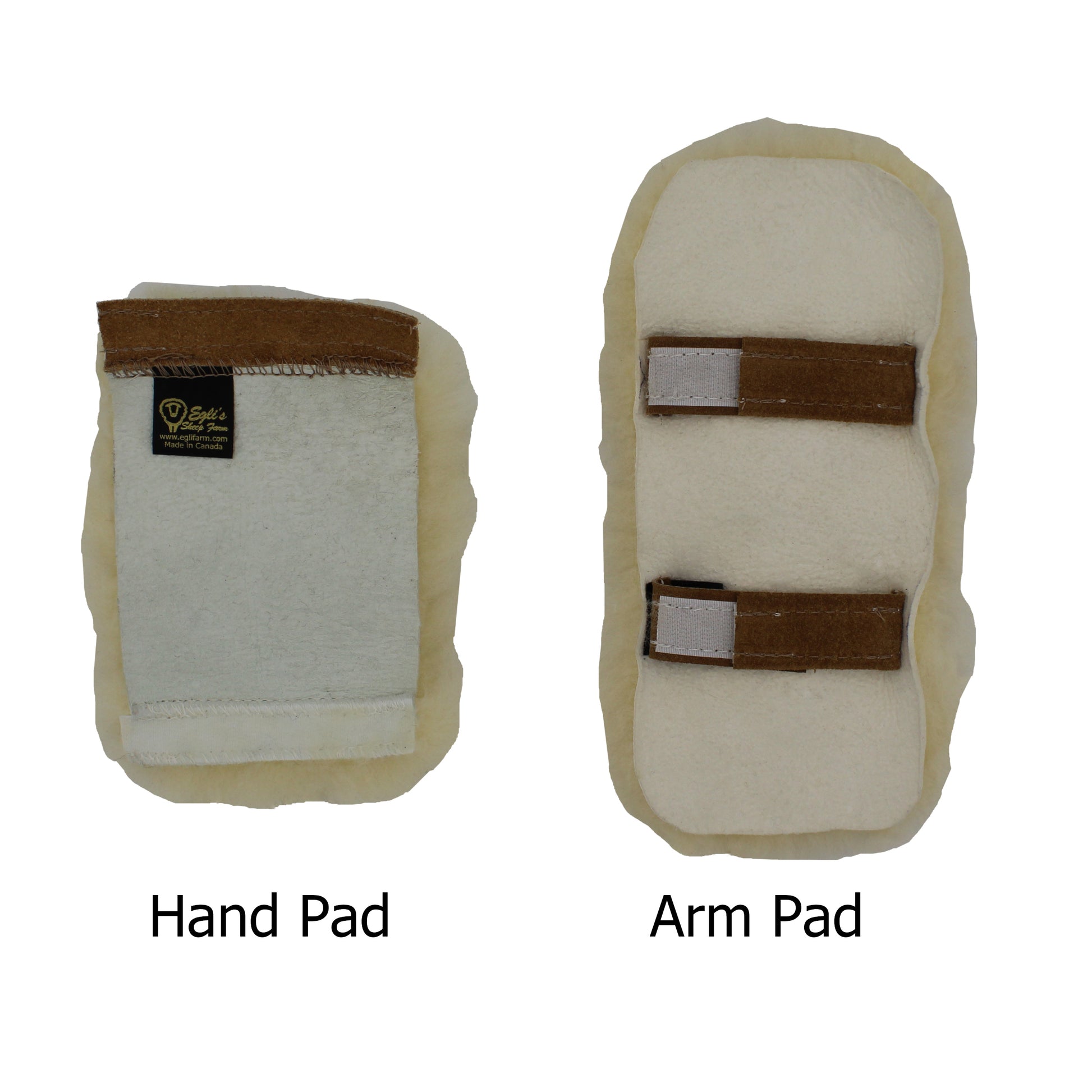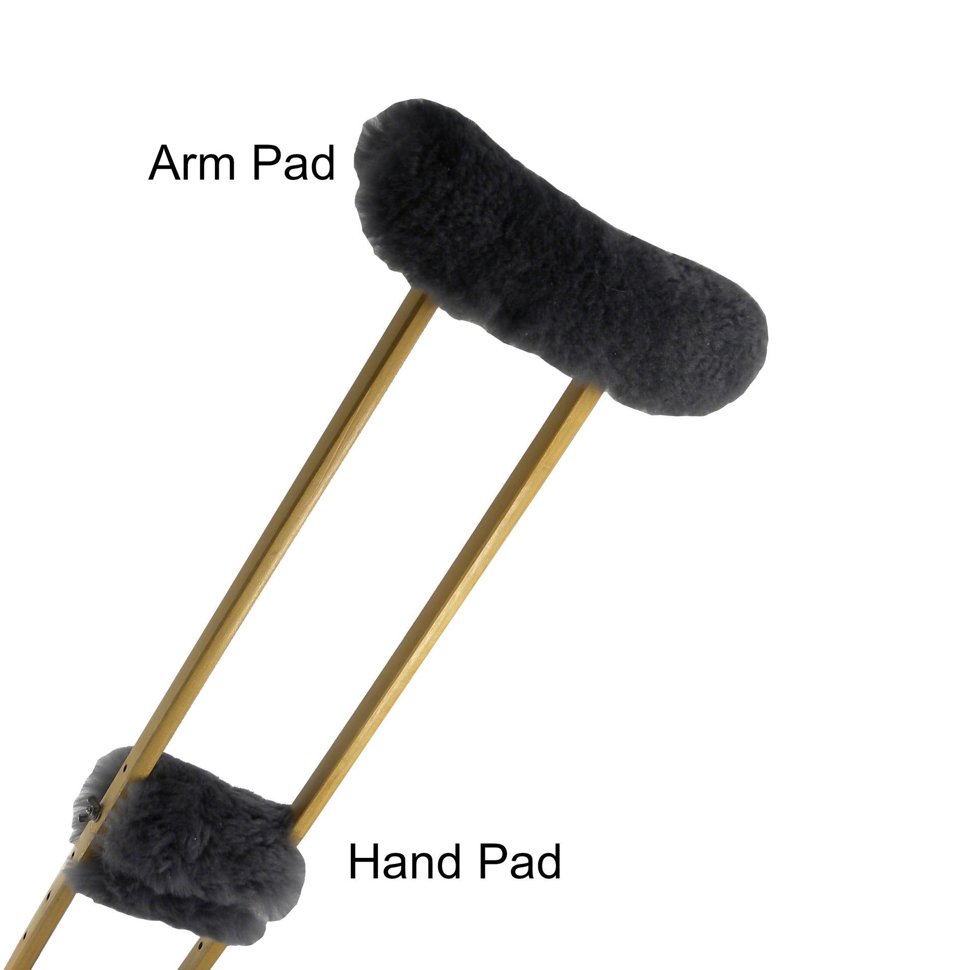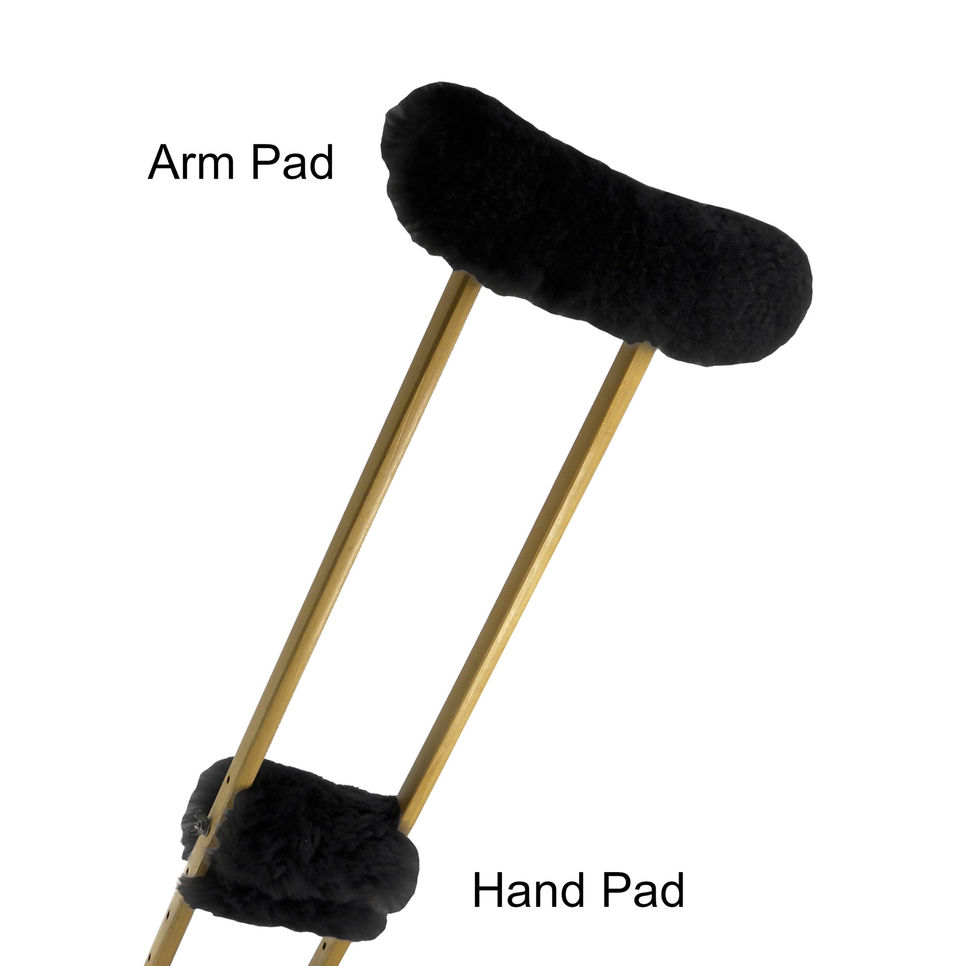 Made from genuine sheepskin, these crutch pads fit onto the arm or hand pad to help reduce discomfort. The arm pad attaches to the crutch with 2 Velcro® brand straps. The hand pad attaches with one Velcro® brand strap. Machine washable. We recommend Eucalan Woolwash for cleaning.