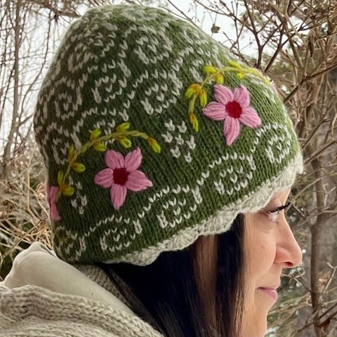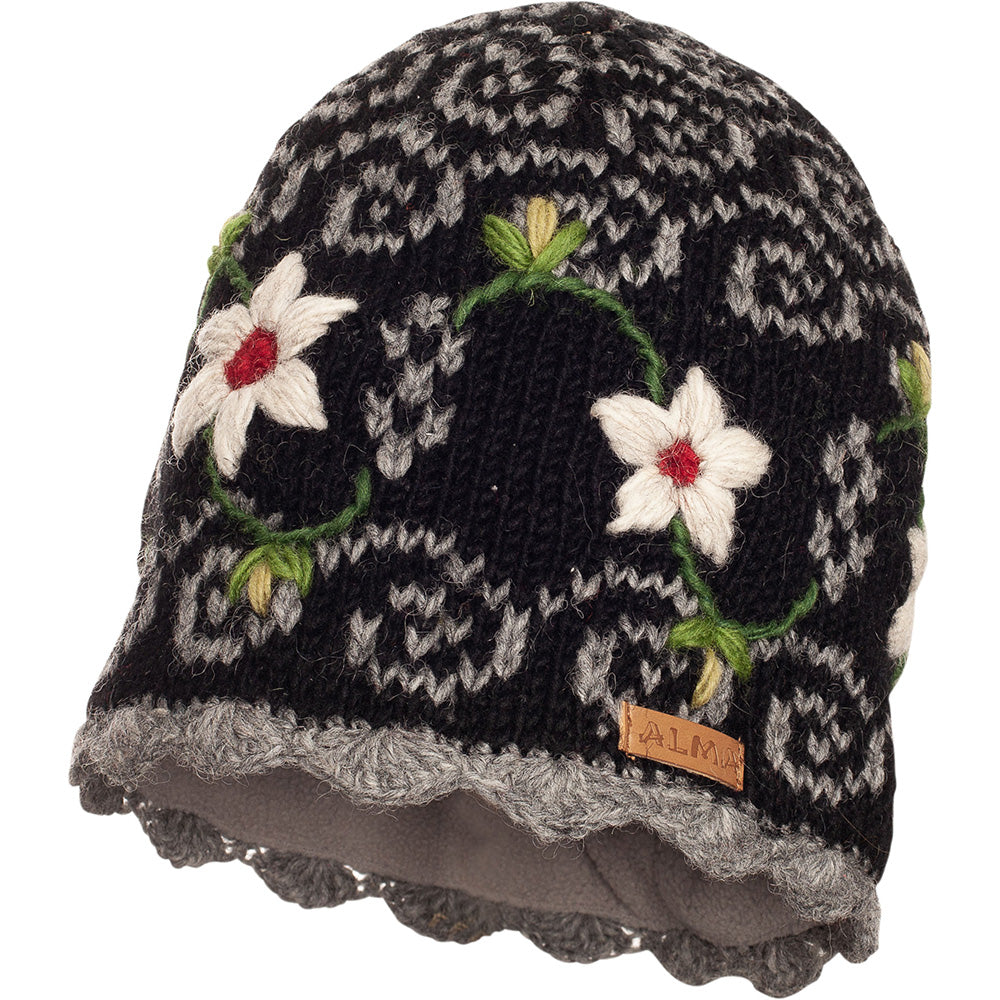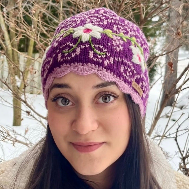 Embroidered wool beanie with polar fleece lining for added comfort and warmth. Matching mitts available.