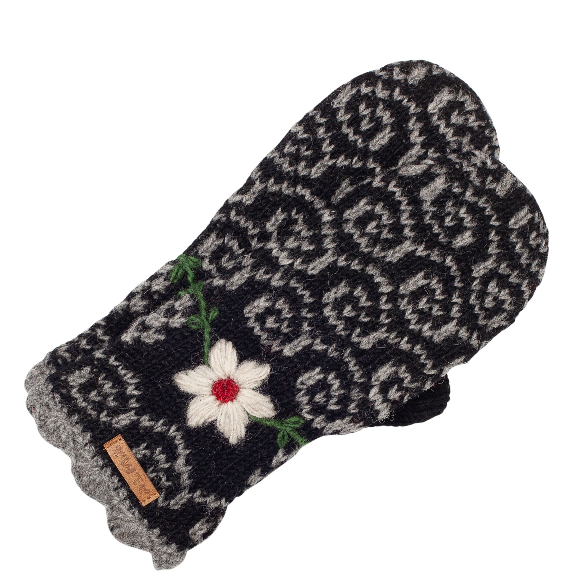 Embroidered wool mitts with polar fleece lining for added comfort and warmth. Matching hat available.