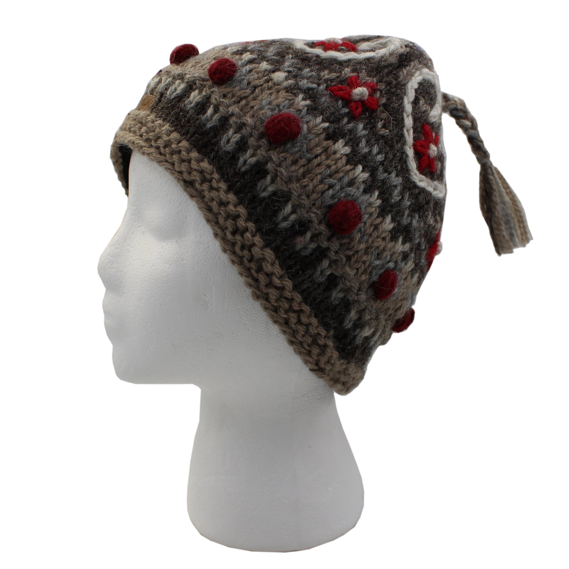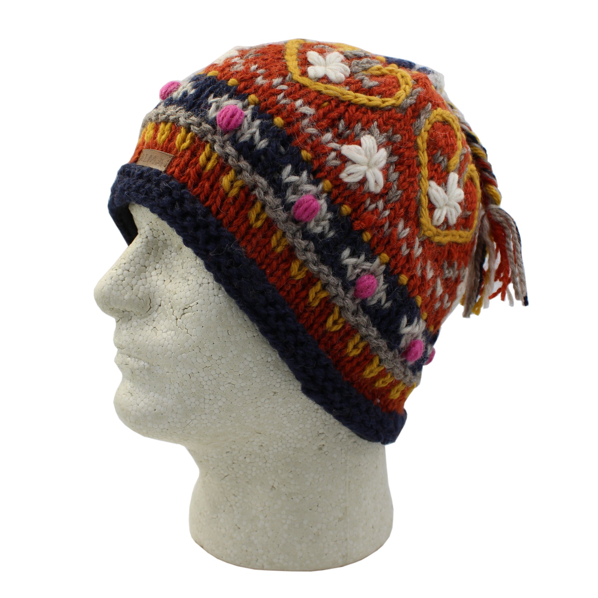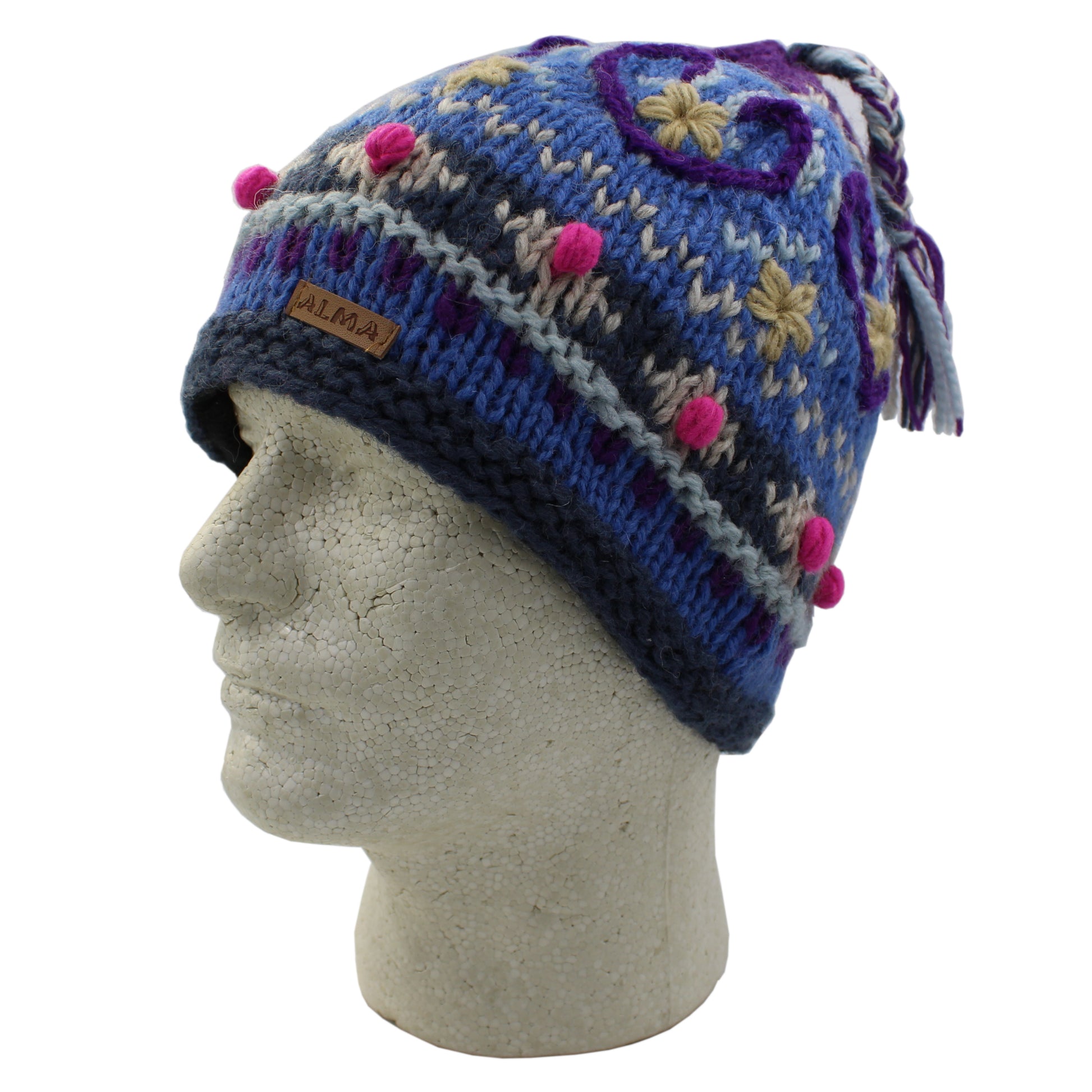 Embroidered wool hat with colourful designs and wool tassel. Polar fleece lining for added comfort and warmth. Matching mitts available.