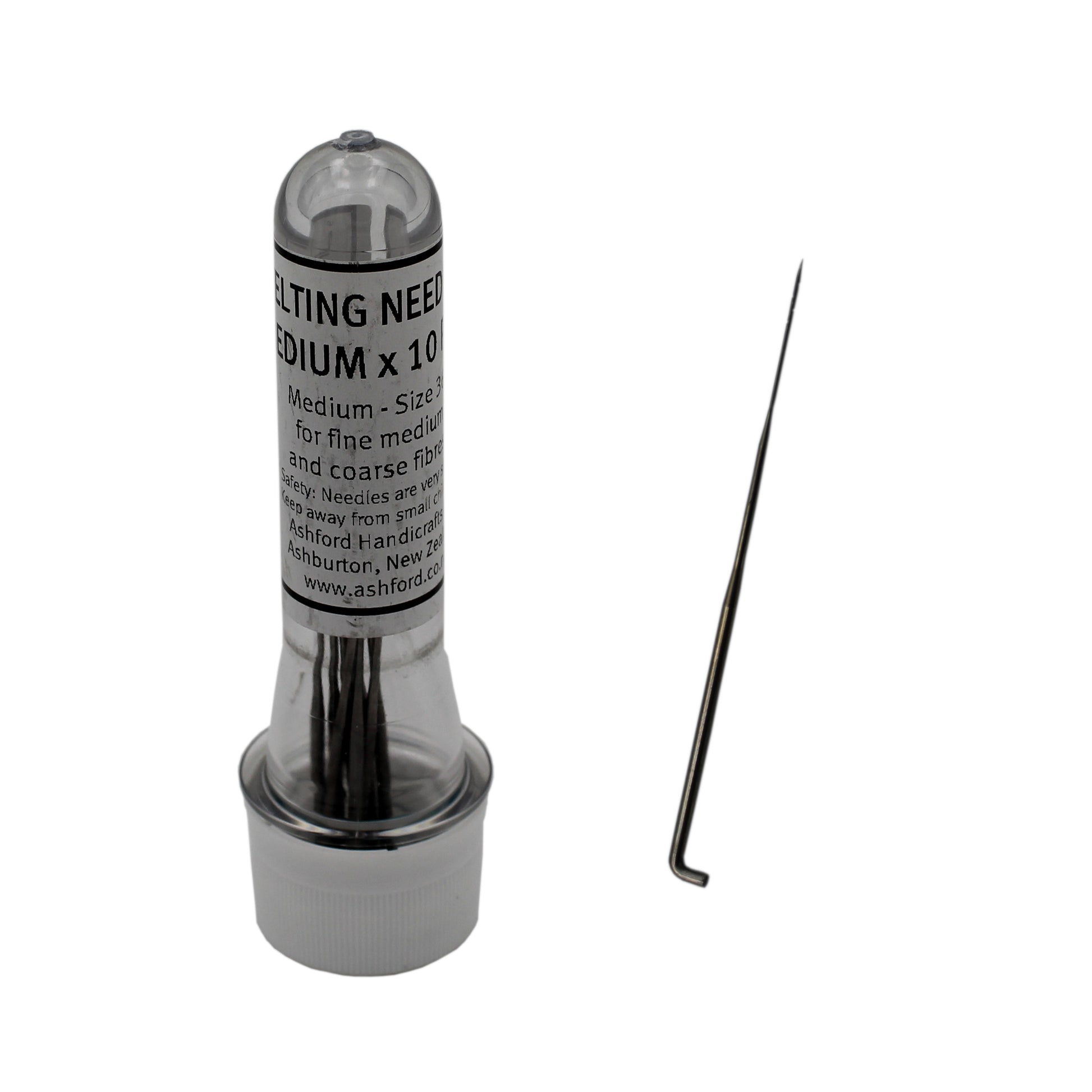 Package of 10 felting needles in a convenient hard plastic storage tube with screw on cap. Available in three different gauges; Medium (36), Star (38) and Fine (40). Needles are approximately 8.5 cm (3 1/4") long.