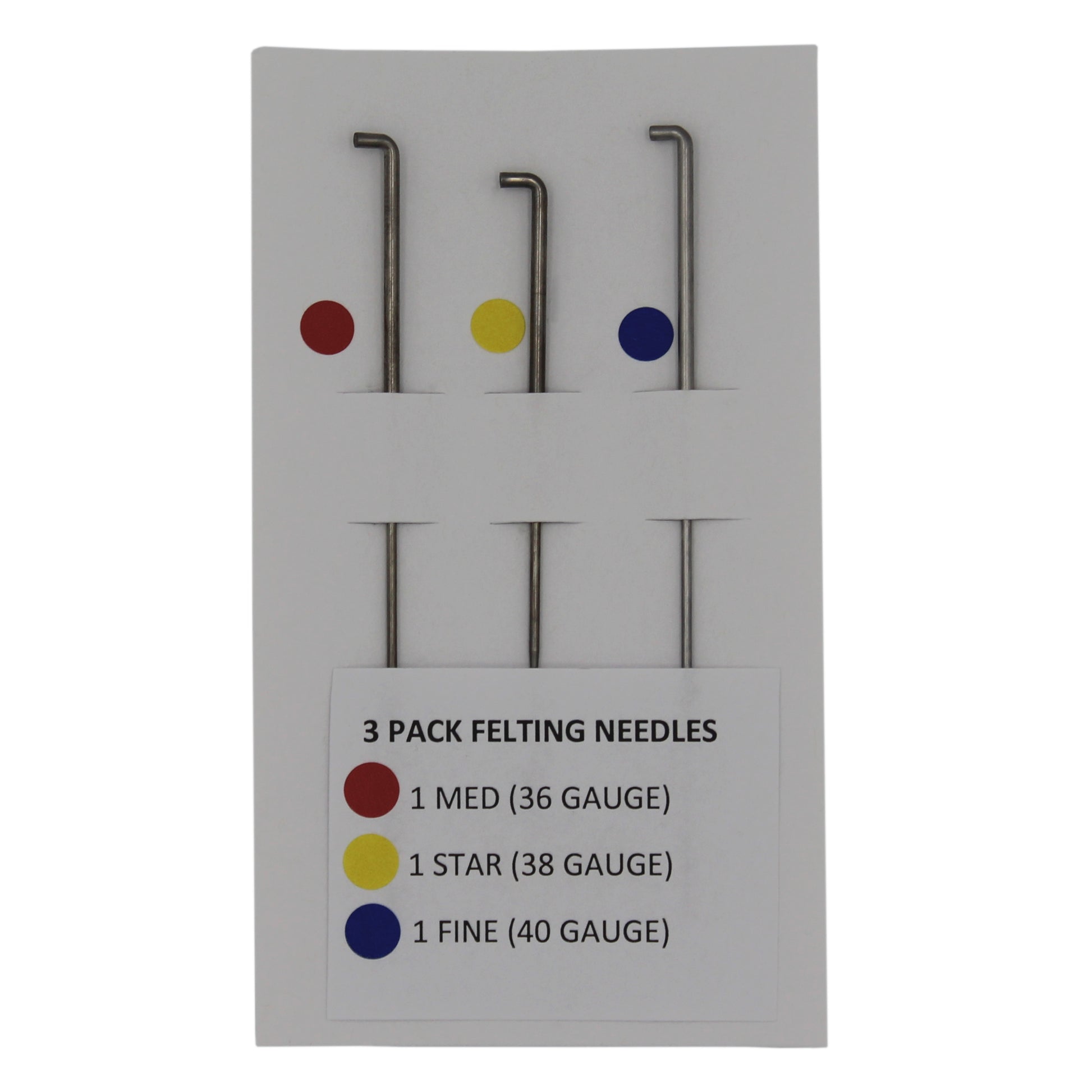 Package of 3 felting needles - one of each size included, Medium (36 Gauge), Fine (40 Gauge) and Star (38 Gauge). Needles are approximately 8.5 cm (3 1/4") long.