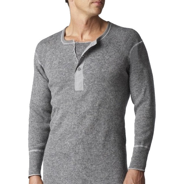 Wool underwear made in Canada by Stanfield's. Designed for absorbency, comfort, warmth and long lasting wear. Generous sleeve length. Ribbed cuffs. Double front. Military insert shoulders. 3 button placket. Machine wash and dry. Do not bleach. 80% wool, 20% nylon.