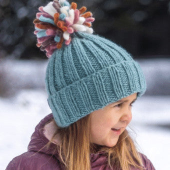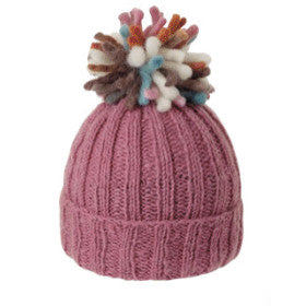 Solid colour ribbed design toque with large tie dye pompom. 100% wool with sewn-in polyester fleece lined headband.