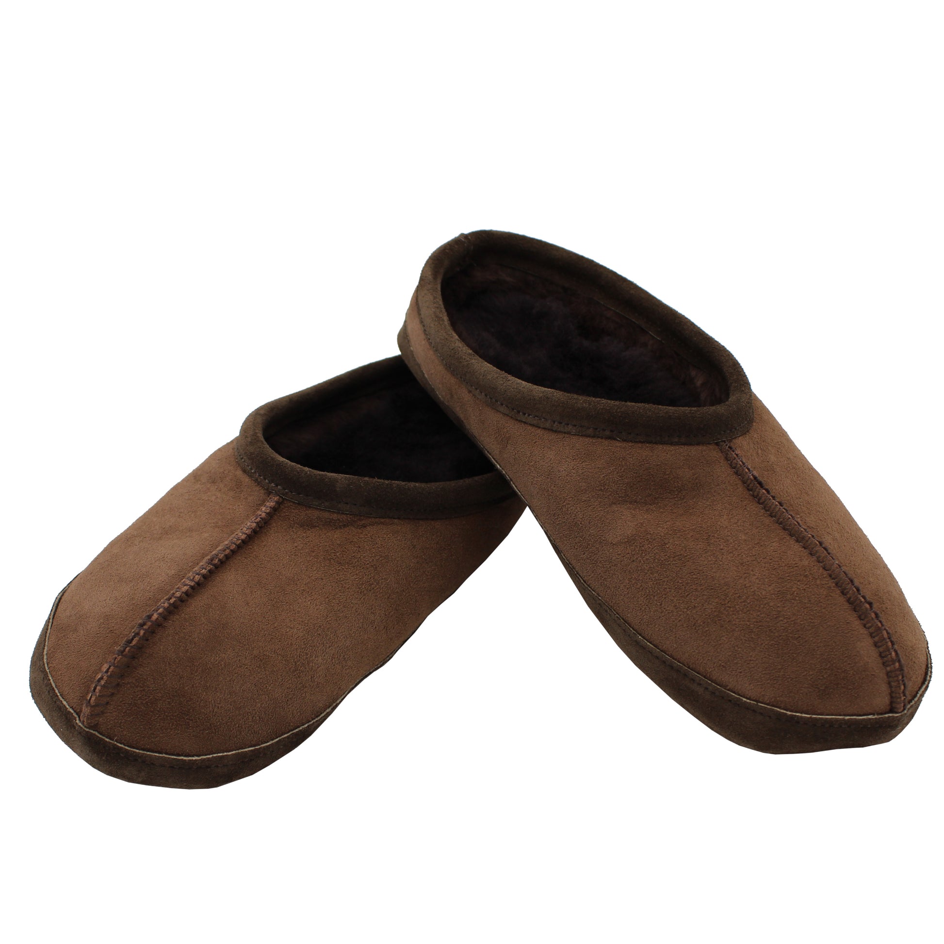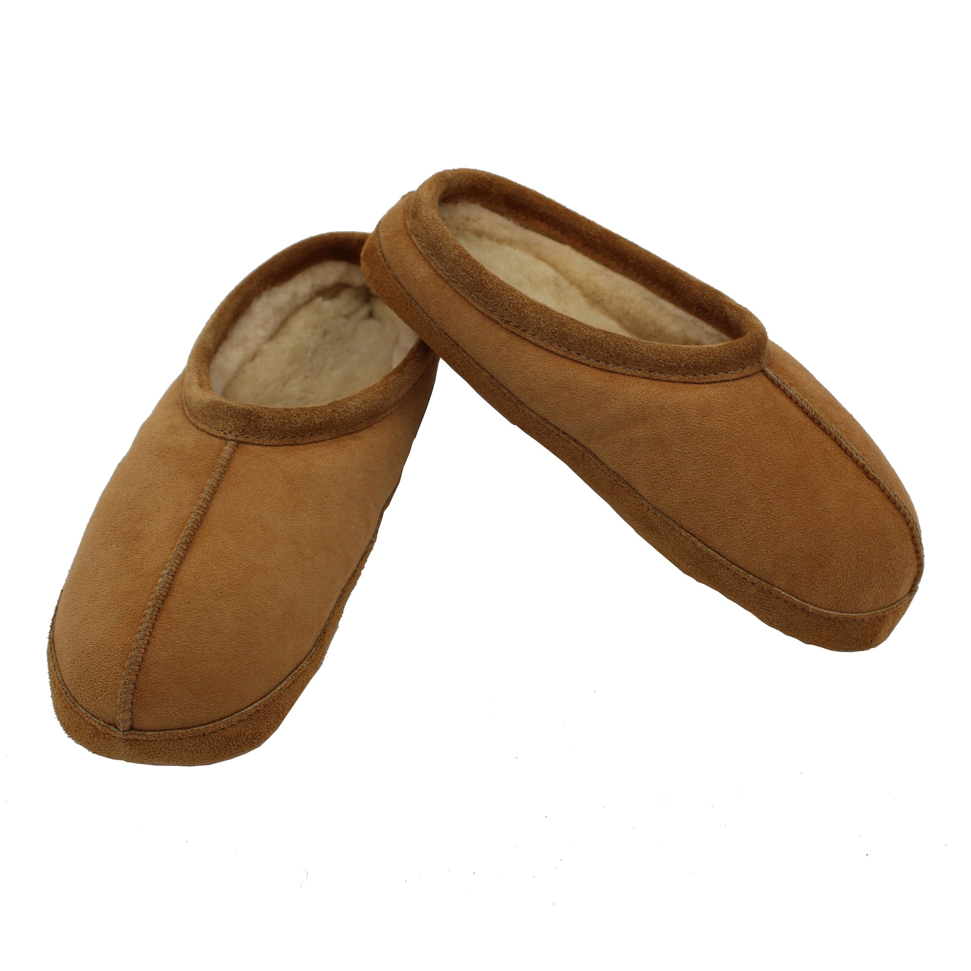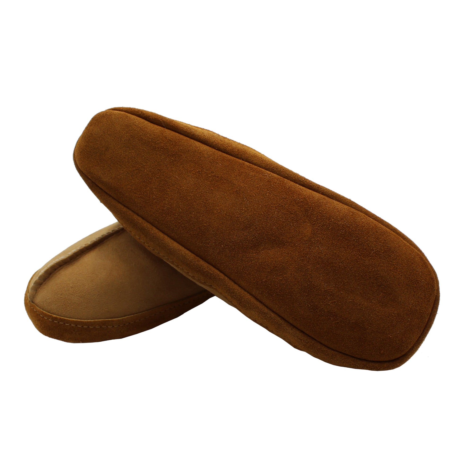 Slip-on scuffs made from genuine sheepskin. Suede outside with soft, dense shearling inside for natural comfort and warmth. Leather outer sole. Care information here.