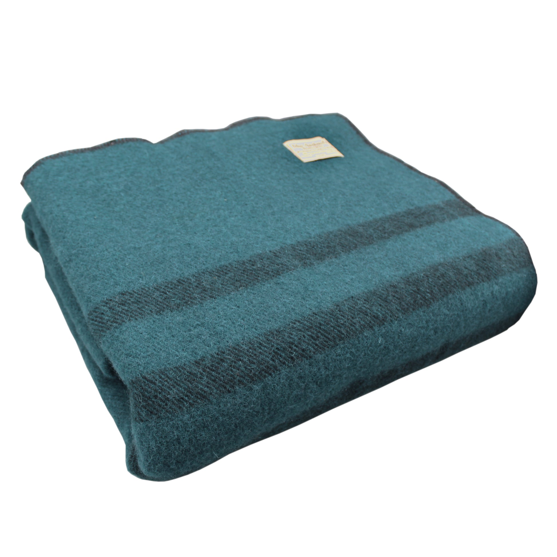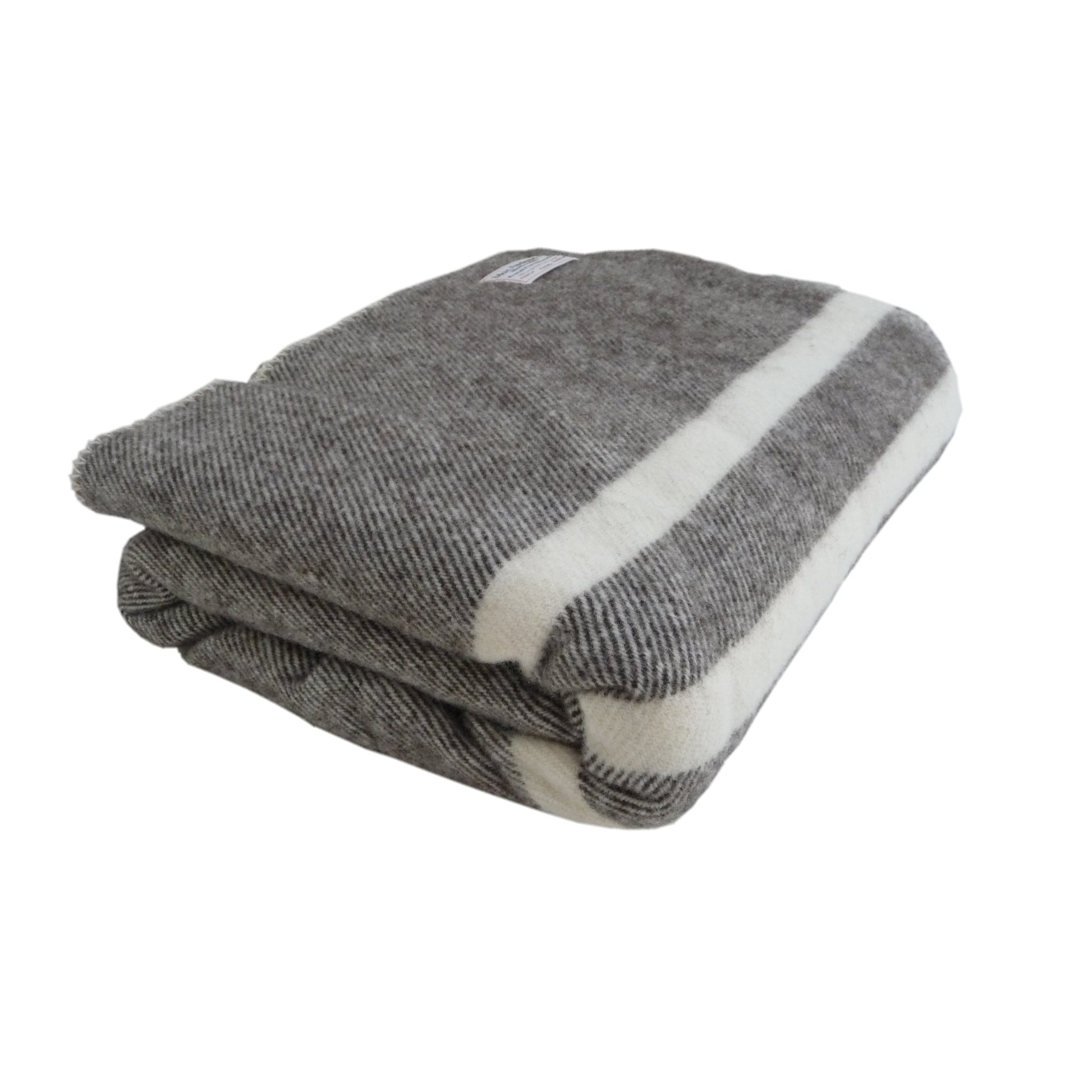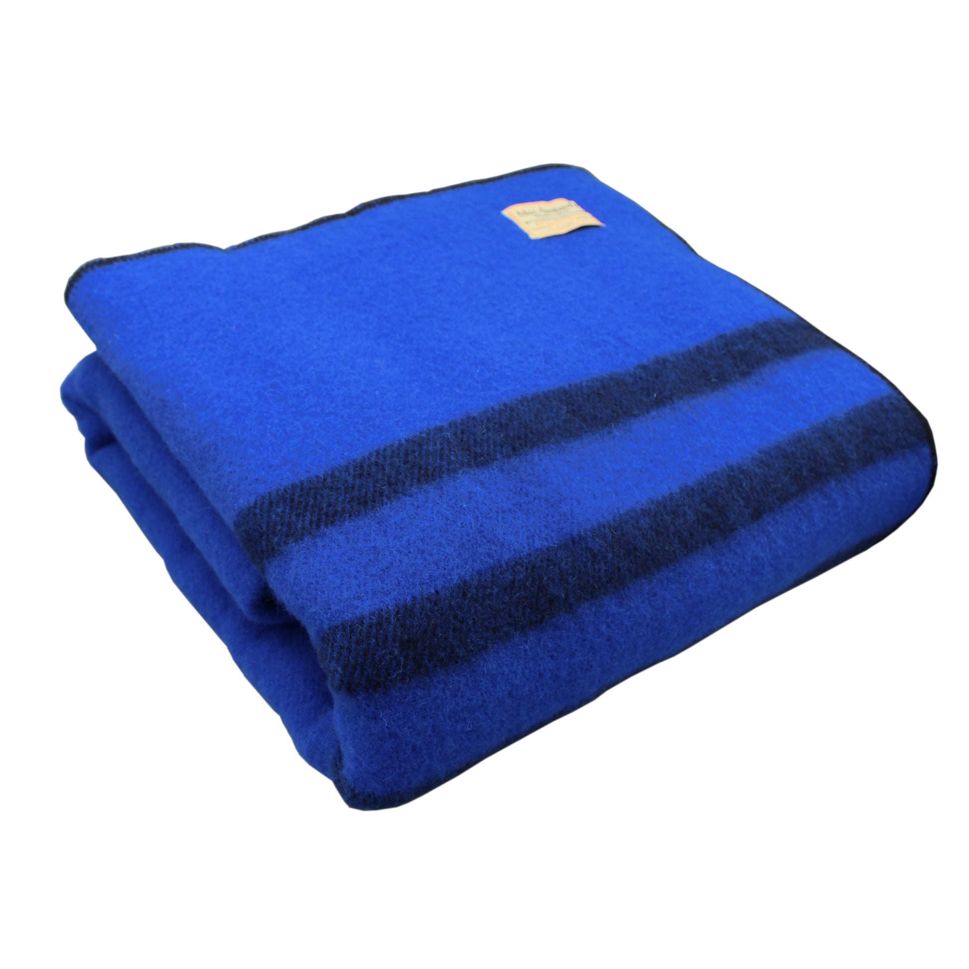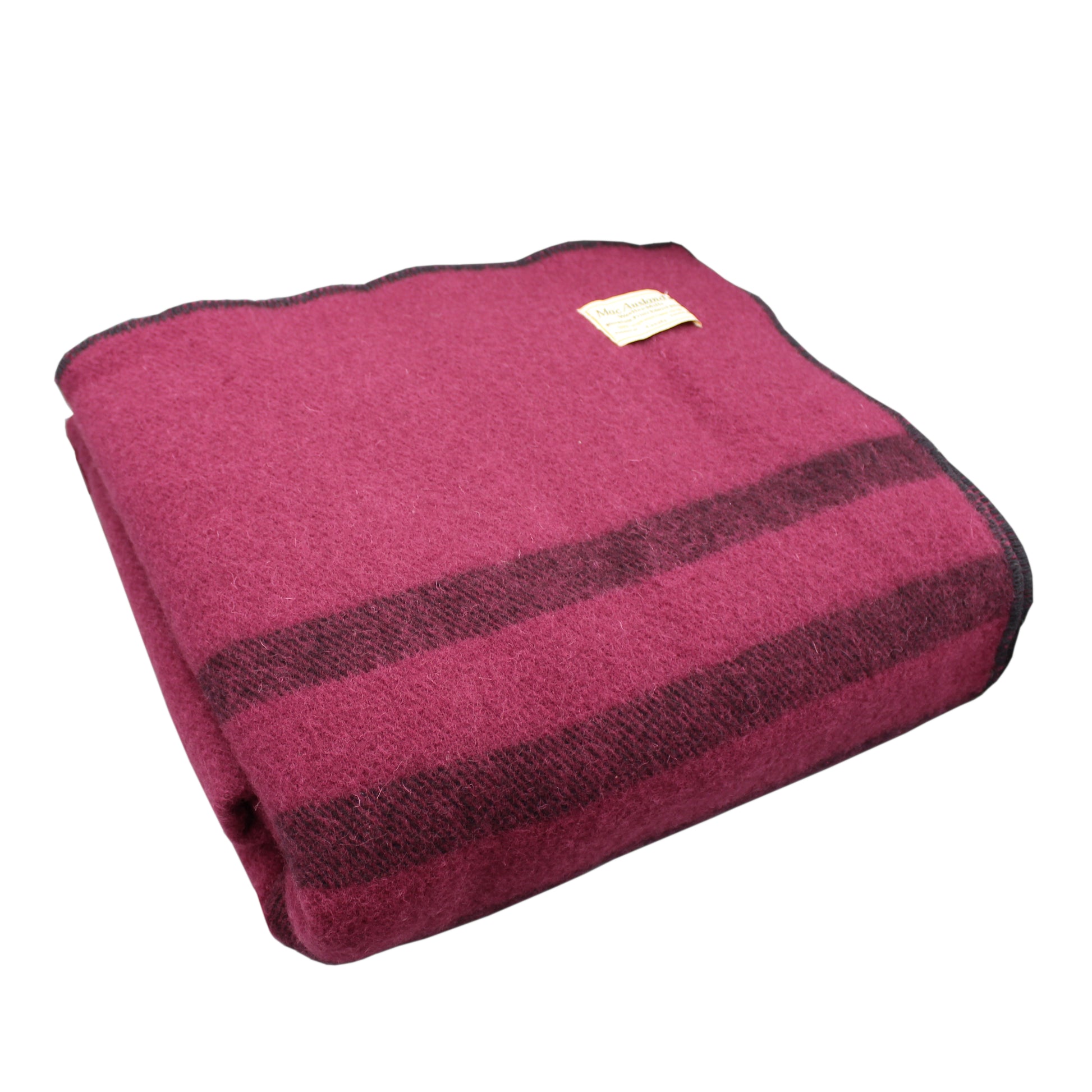 A warm, medium weight wool blanket. Great as an extra layer on your bed or to cuddle up with on your couch. Solid colour with three accent stripes across the top and bottom.