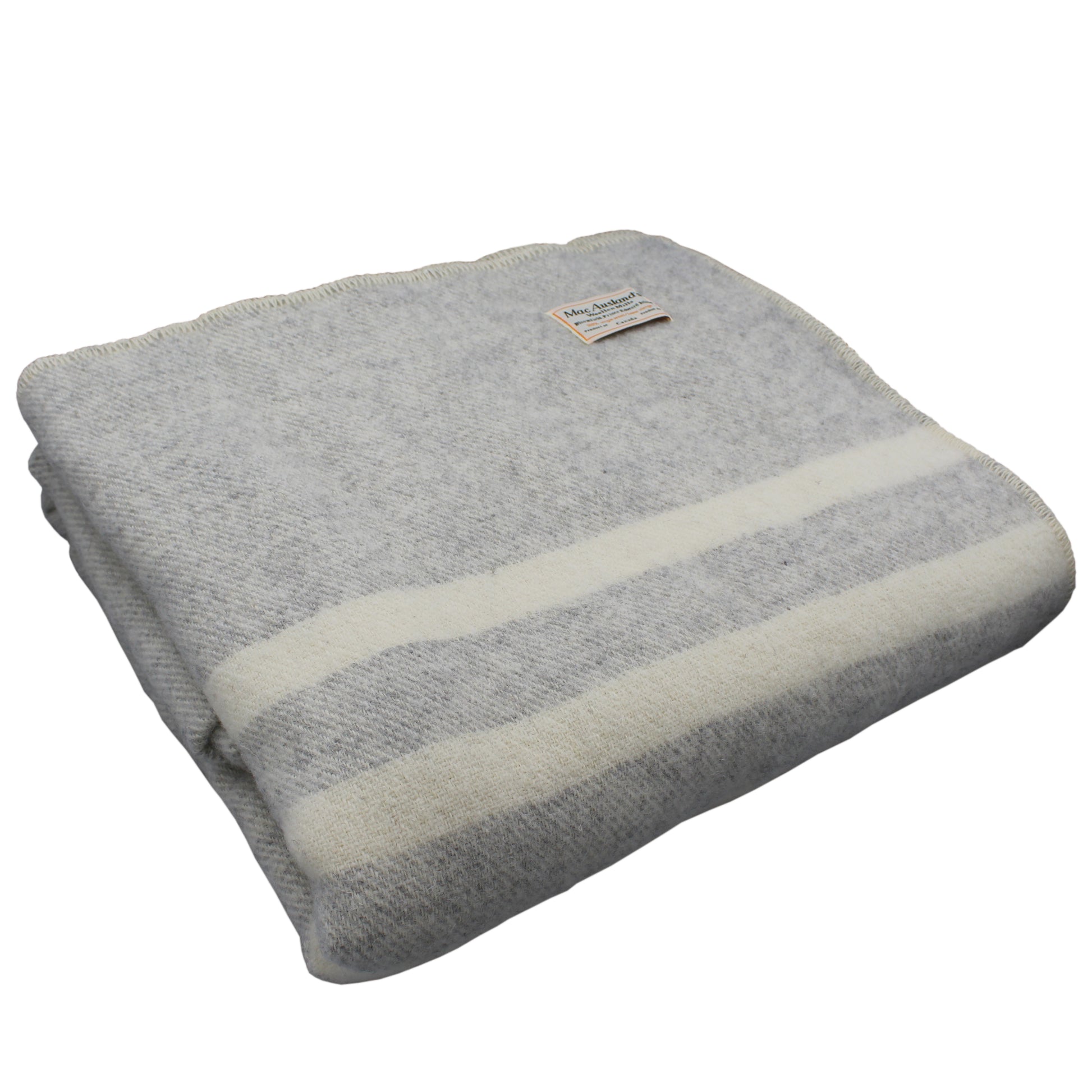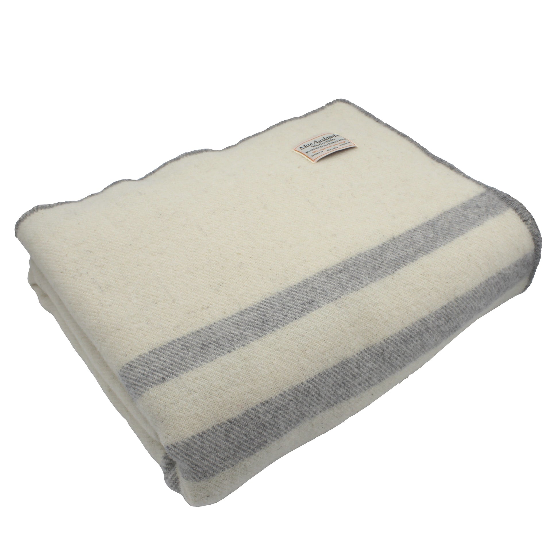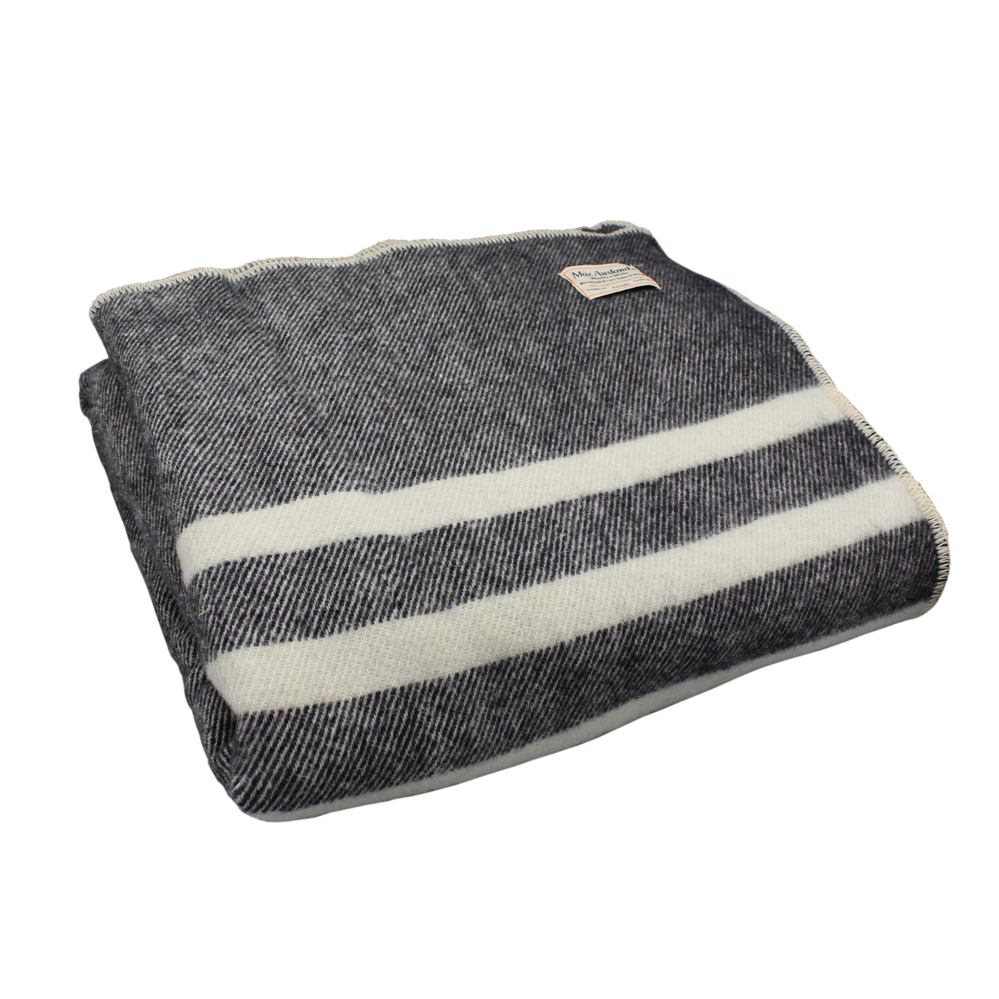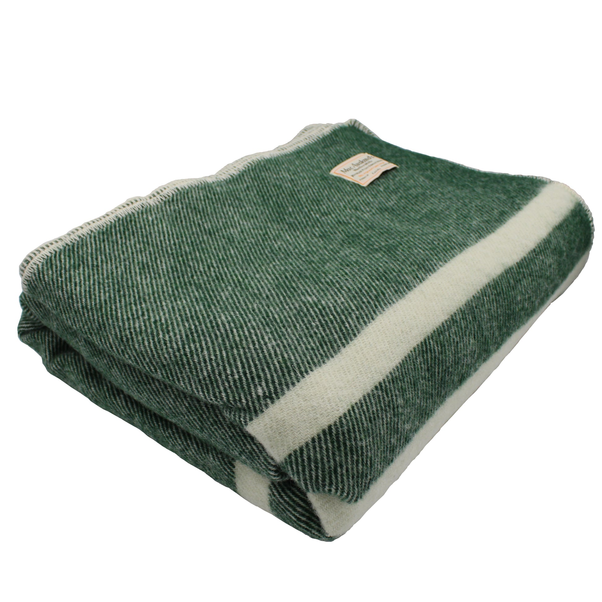 A warm, medium weight wool blanket. Great as an extra layer on your bed or to cuddle up with on your couch. Solid colour with three accent stripes across the top and bottom.