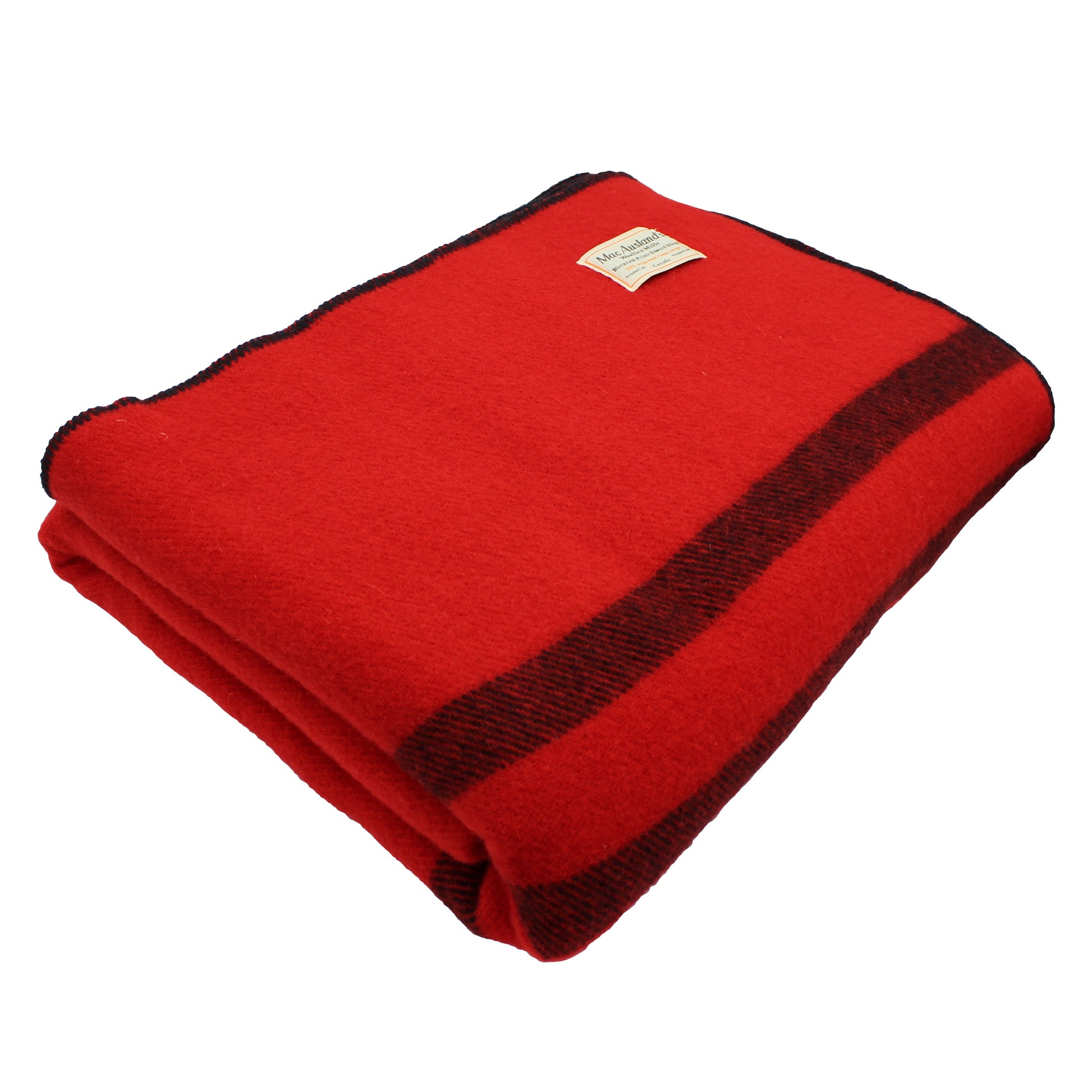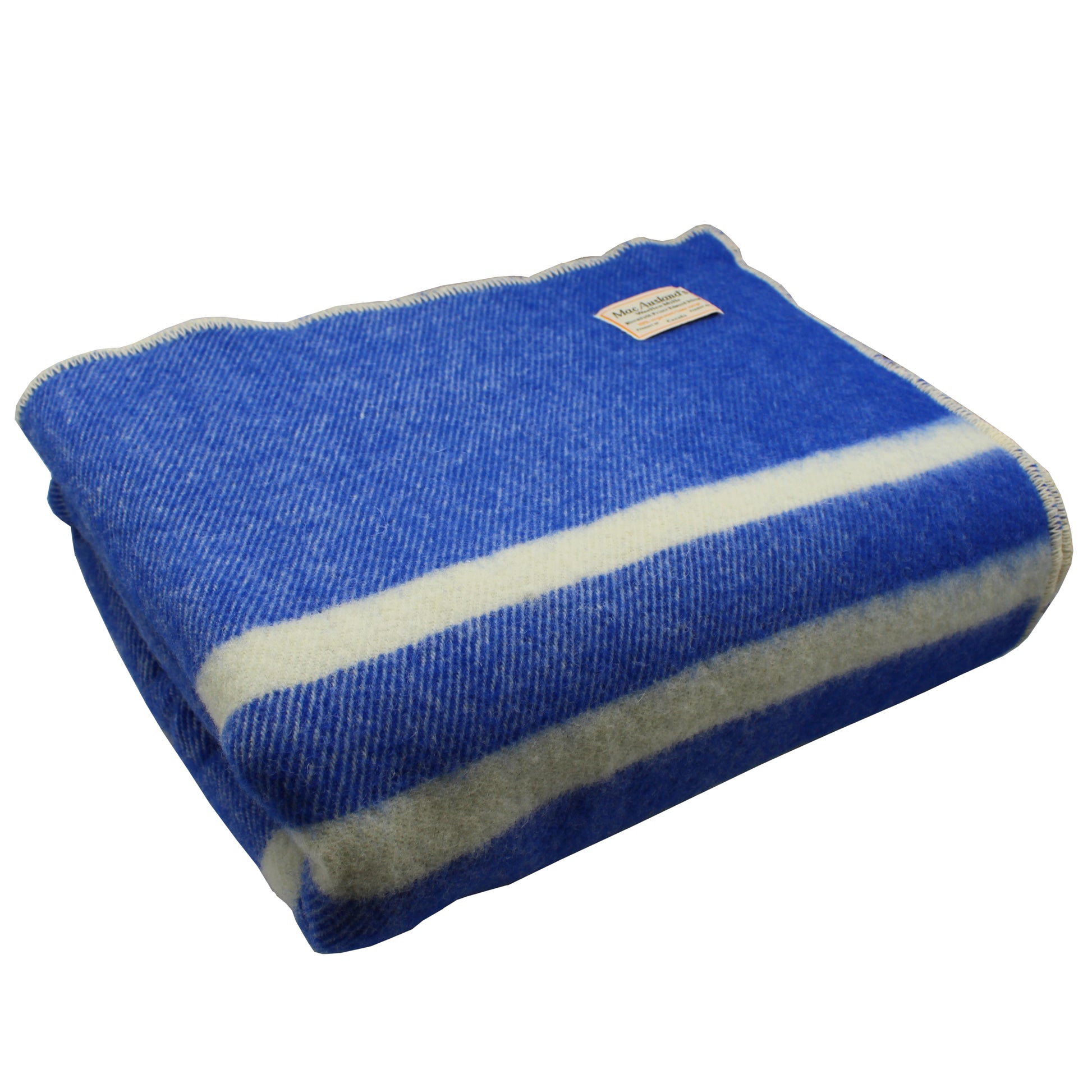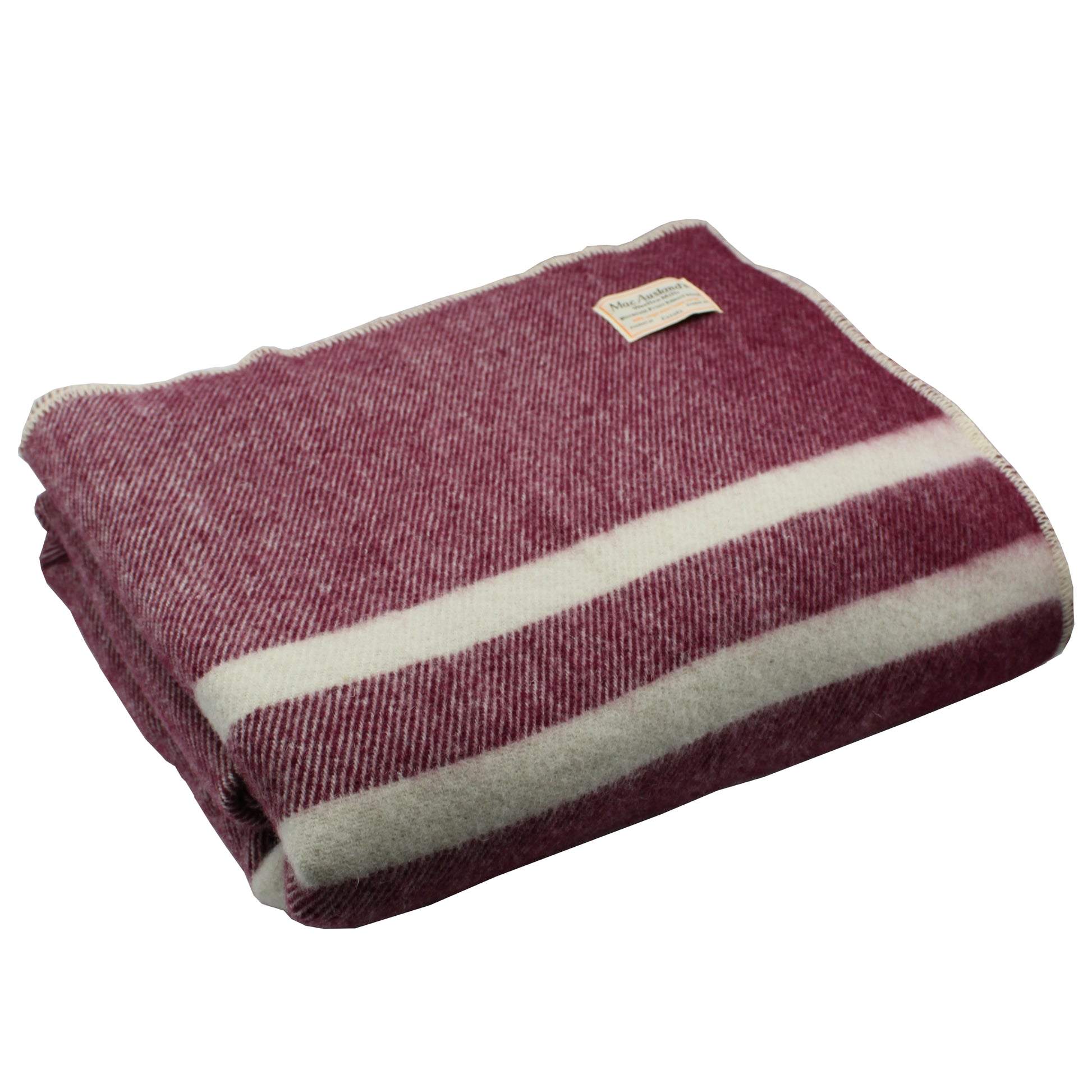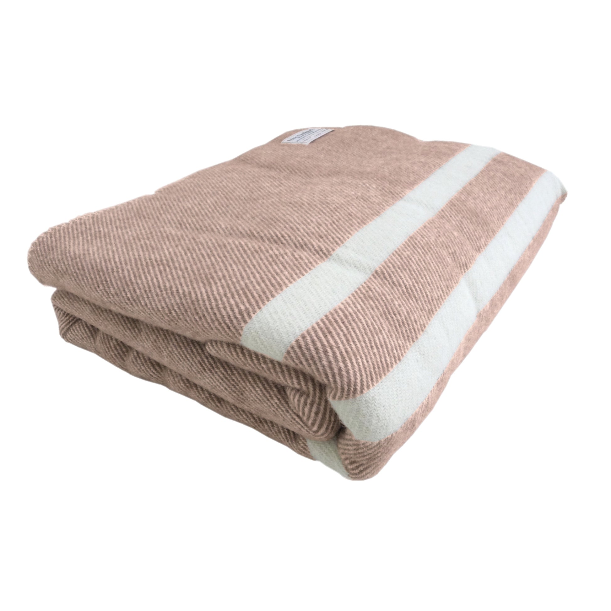 A warm, medium weight wool blanket. Great as an extra layer on your bed or to cuddle up with on your couch. Solid colour with three accent stripes across the top and bottom.