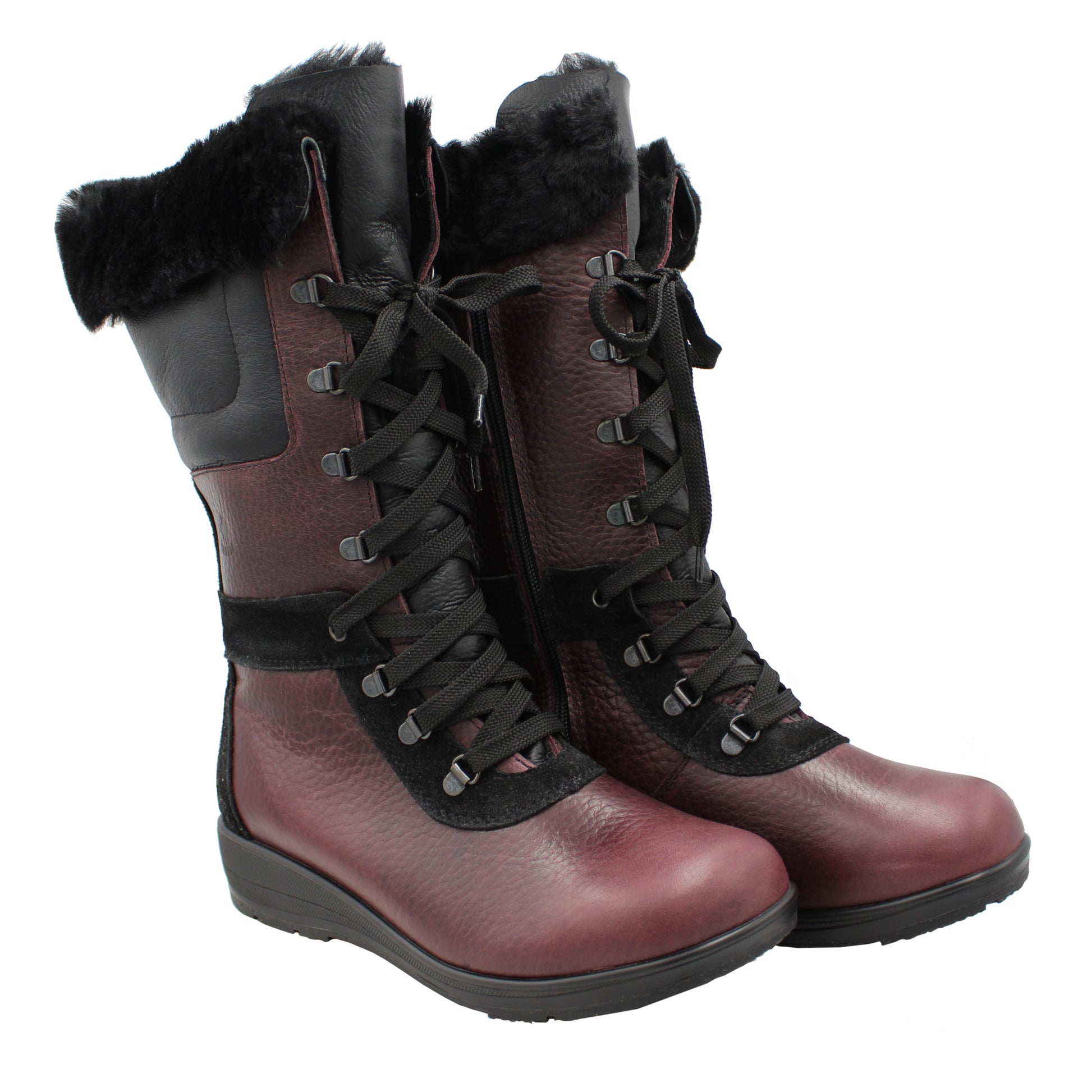 Genuine leather lace up boots with side zipper. Shearling collar and wool lining provides warmth and comfort. Upper section of boot is lined with sheepskin while the lower part is wool lined. Durable rubber soles. Padded foam removable insole. Approximately 31 cm ( 12") tall. D width.