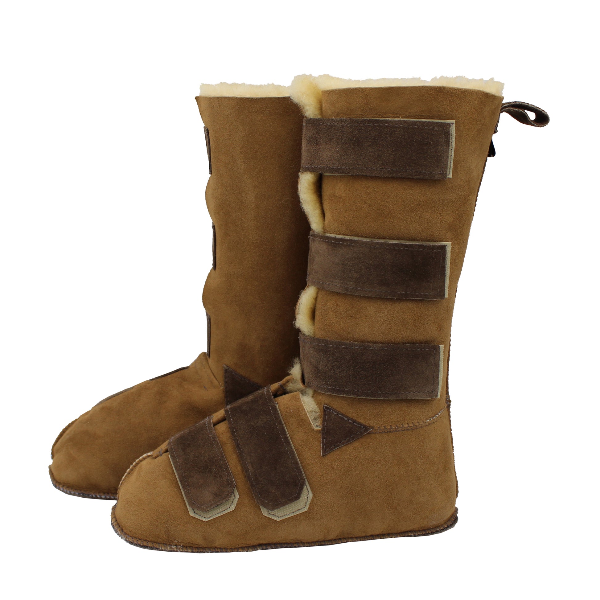 These soft-soled boots are specifically designed for keeping legs and feet warm and comfortable. The upper leg portion opens up fully to easily put on the boots and fastens securely closed with Velcro® Brand closures on leather tabs. Made from dense shearling sheepskin with genuine leather suede soles (not suitable as regular walking footwear). Approximately 33 cm (13") tall. Care information here.
