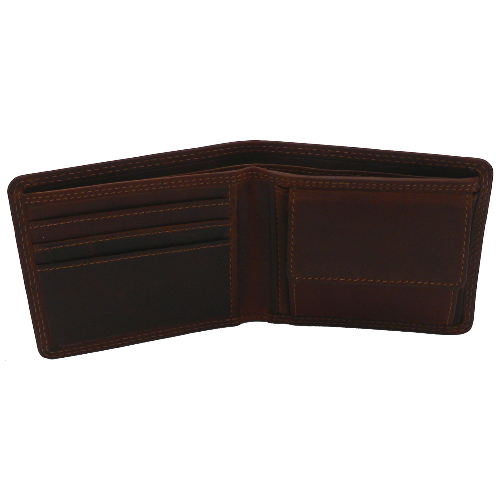 Rugged Earth bifold wallet with 3 credit card slots, change pouch and centre bill fold. Genuine leather with double stitching for durability.