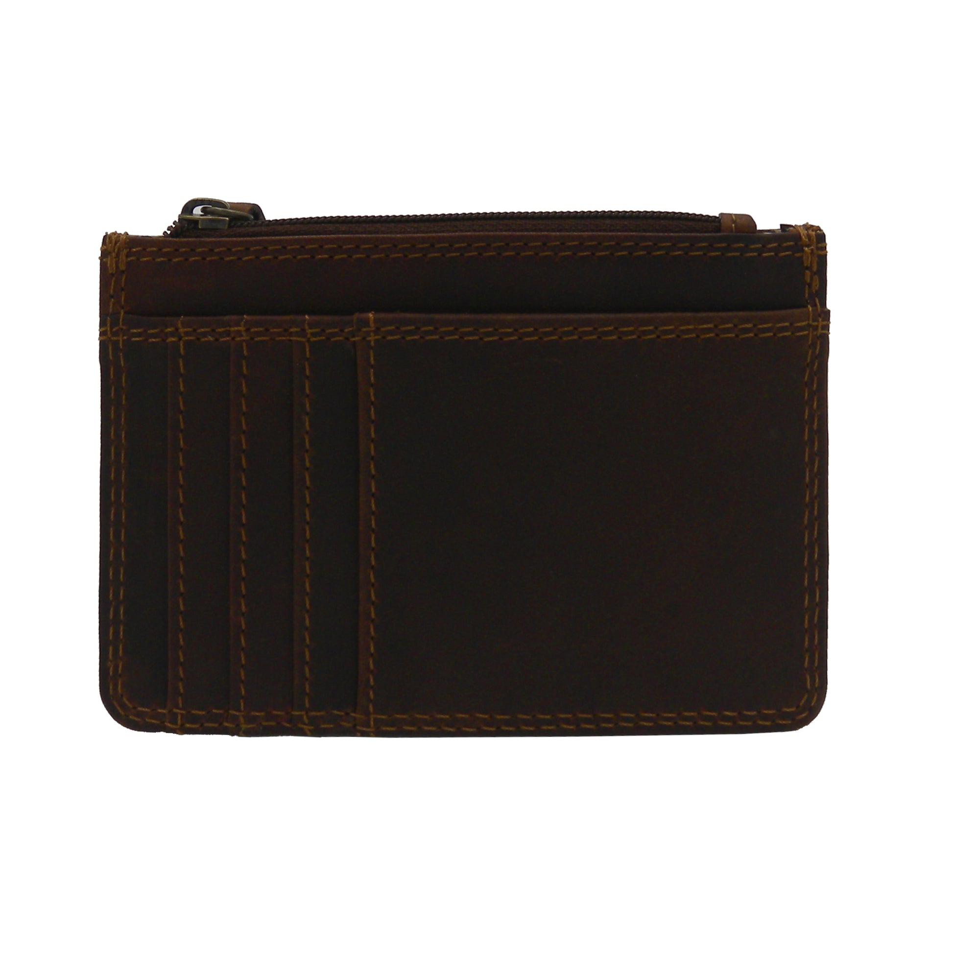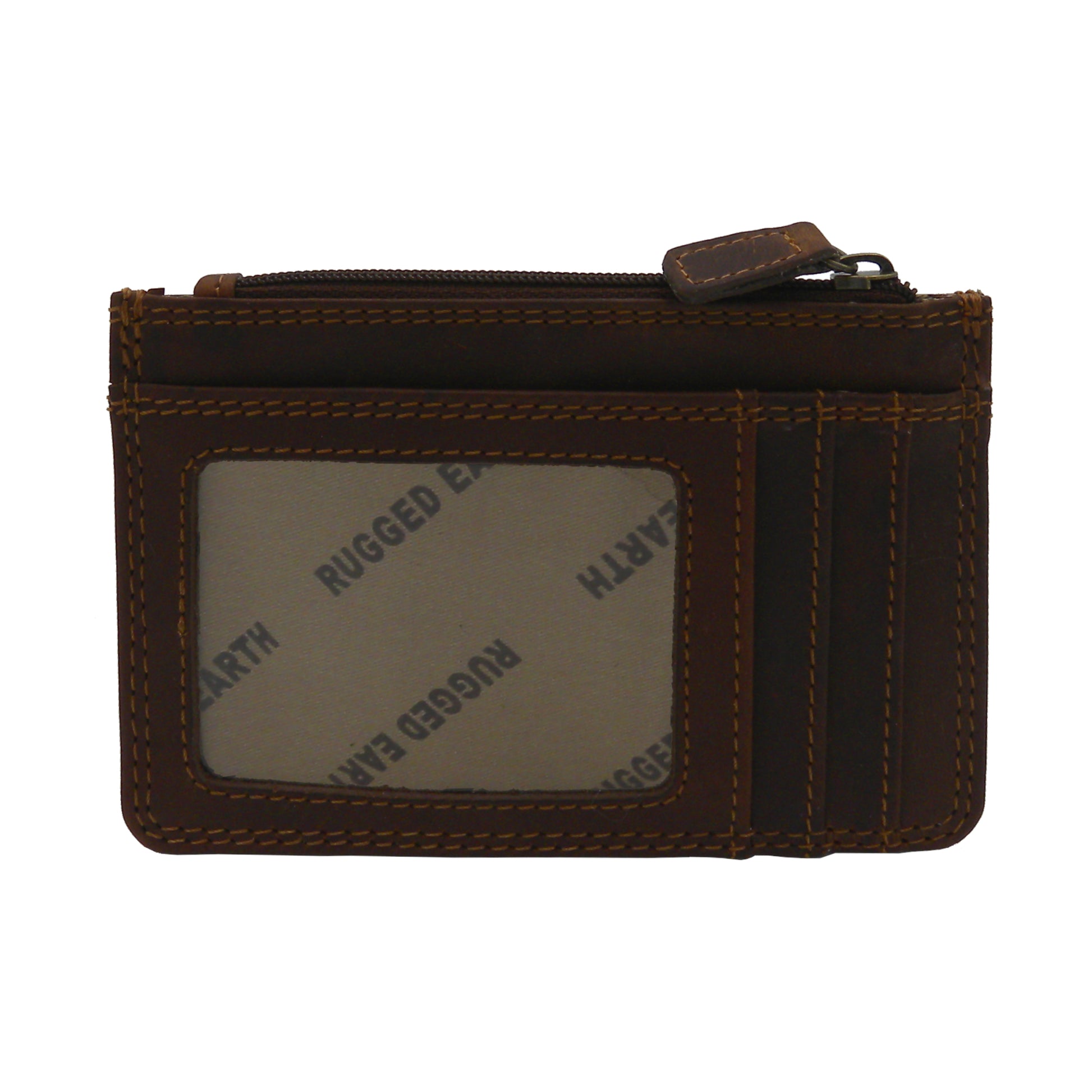 Rugged Earth credit card holder with eight credit card slots, zippered change pouch and clear ID pocket. Genuine leather with double stitching for durability.