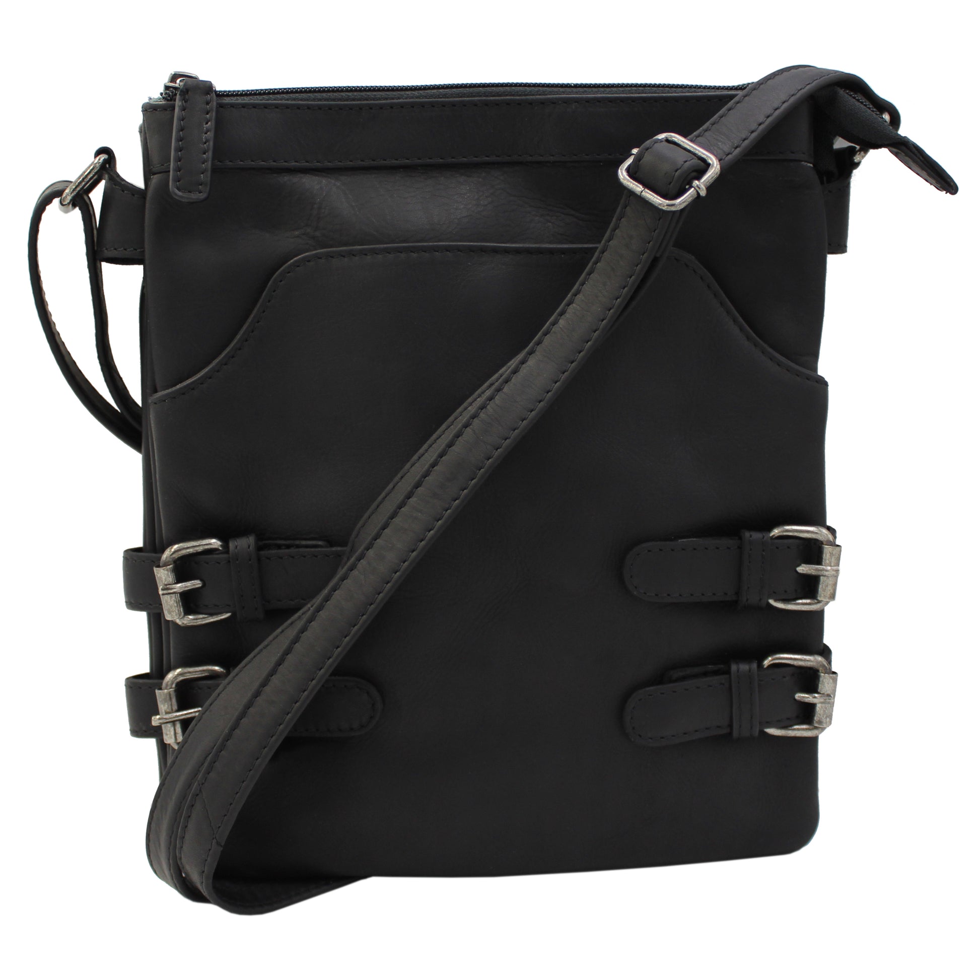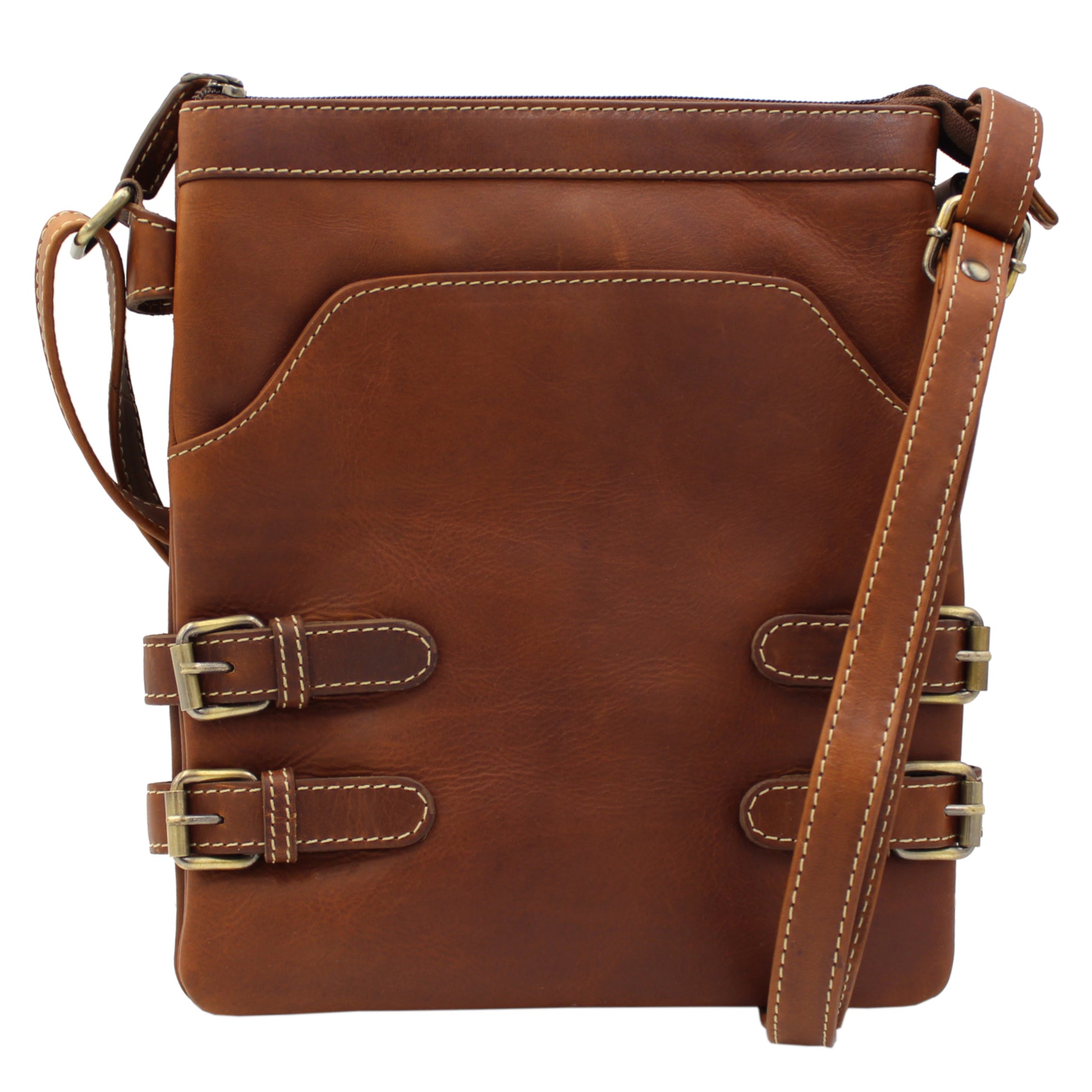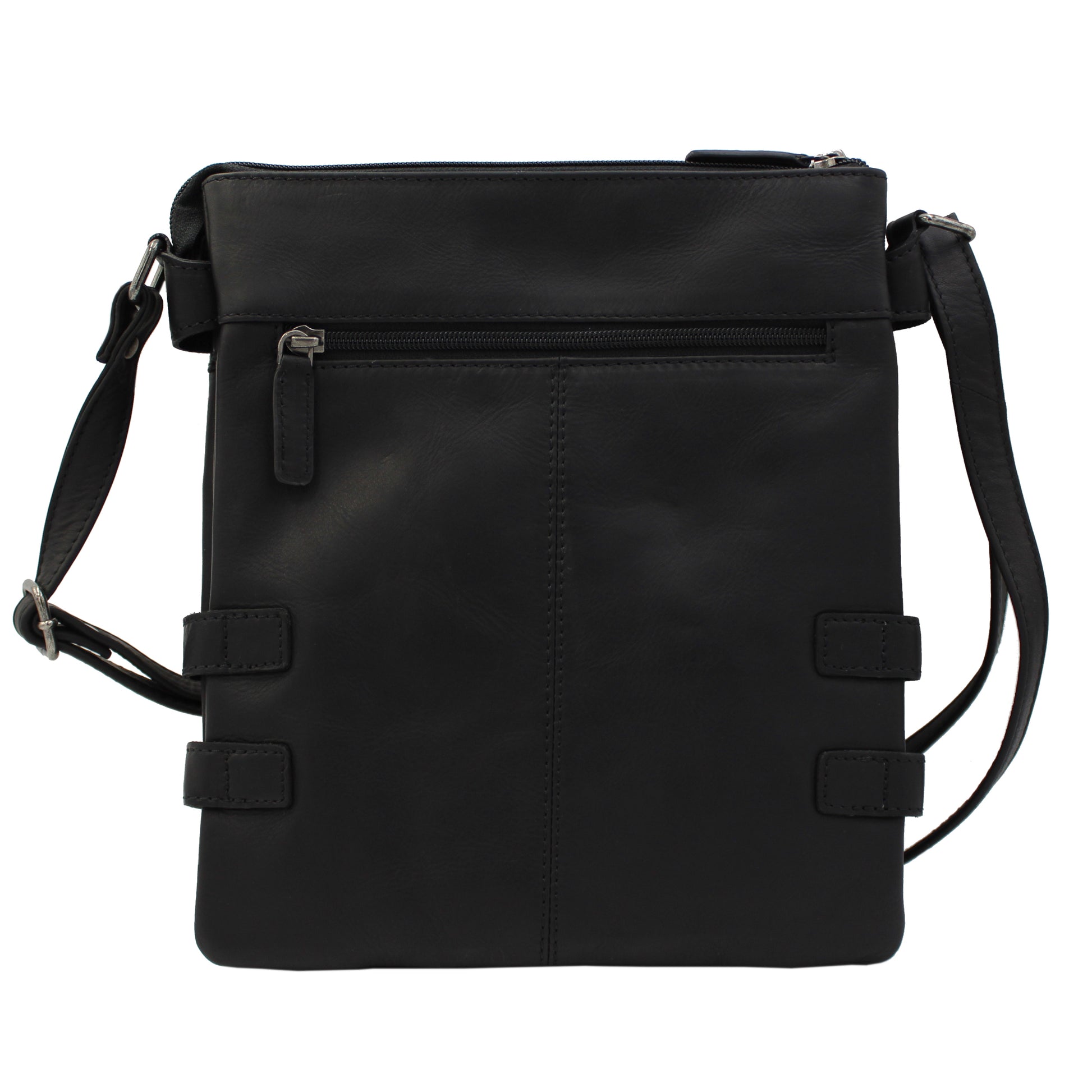 Rugged Earth leather bag with two zippered main compartments, zippered back pocket and front pouch with magnetic snap closure. Front compartment contains an open cell phone puch while the back compartmant features a zippered side pocket. Two decorative straps on each side of the bag. Adjustable shoulder strap is approximately 150 cm (59") long. Made from genuine leather with fabric lining.
