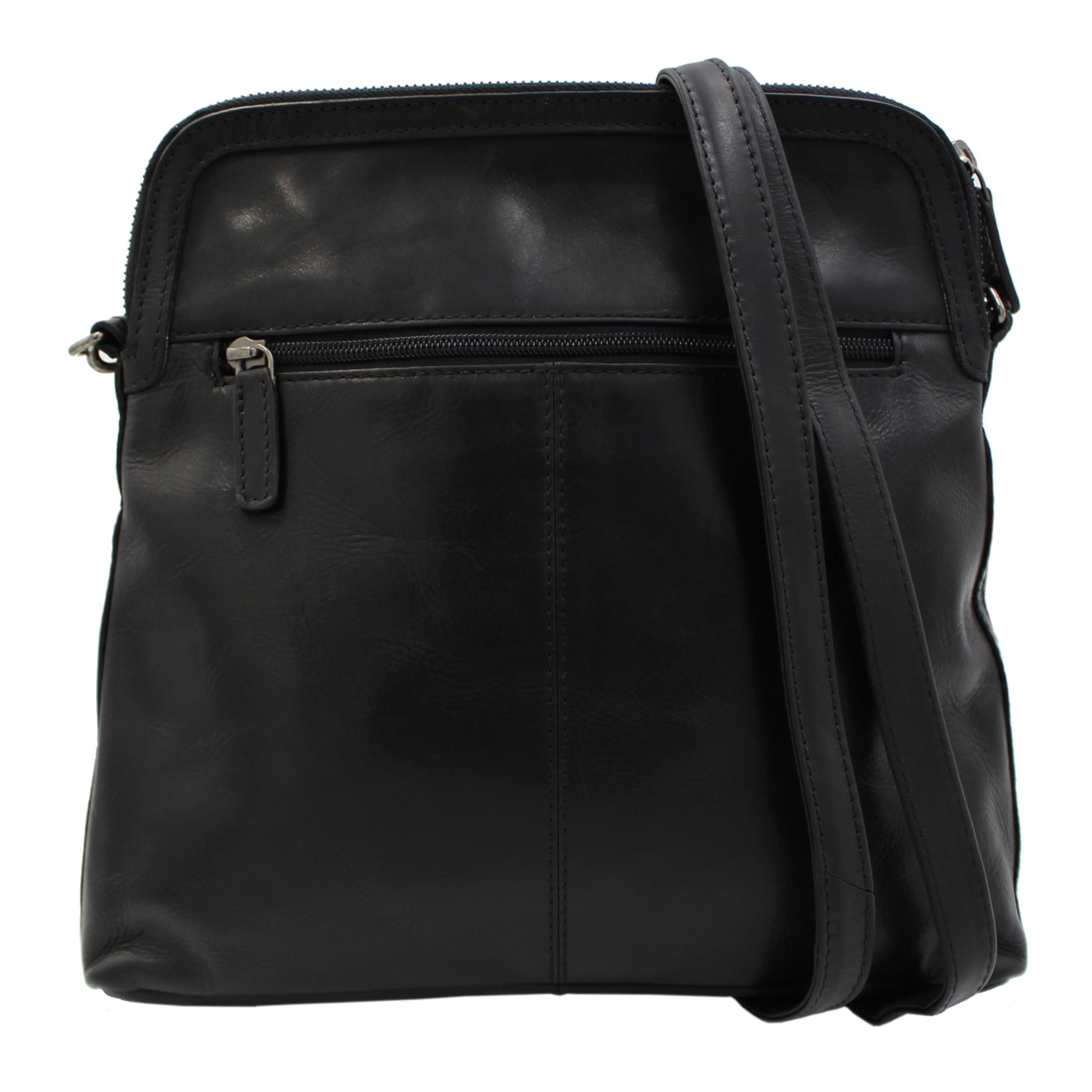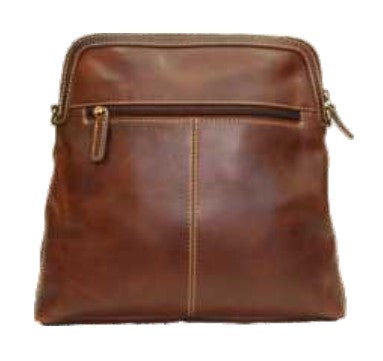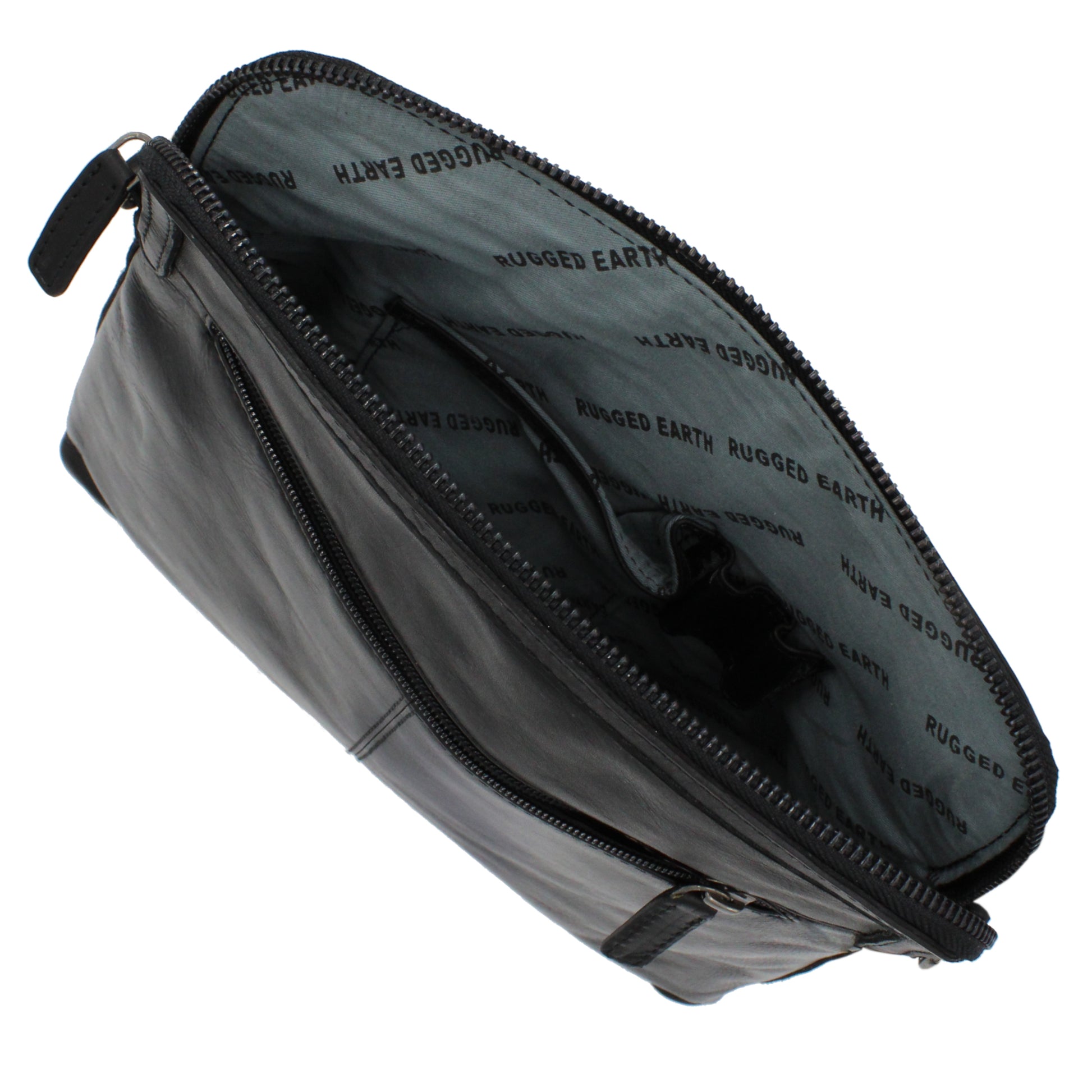 Rugged Earth leather bag with zippered main compartment and zippered back pocket. Main compartment features zippered side pocket, cell phone pouch and two pen holders. Adjustable shoulder strap is detachable and approximately 145 cm (57") long. Made from genuine leather with fabric lining.