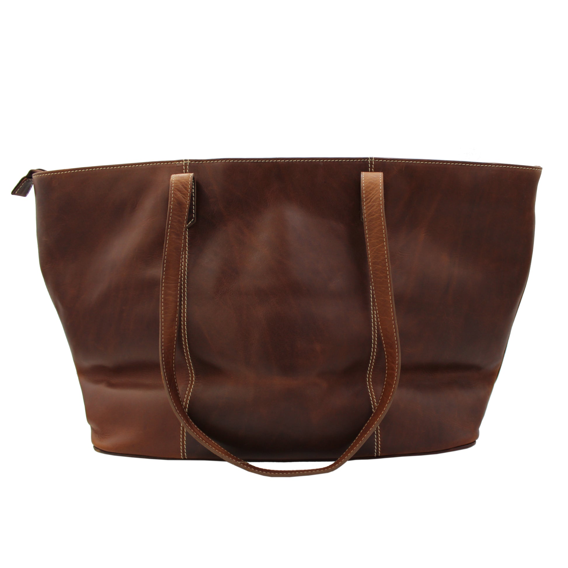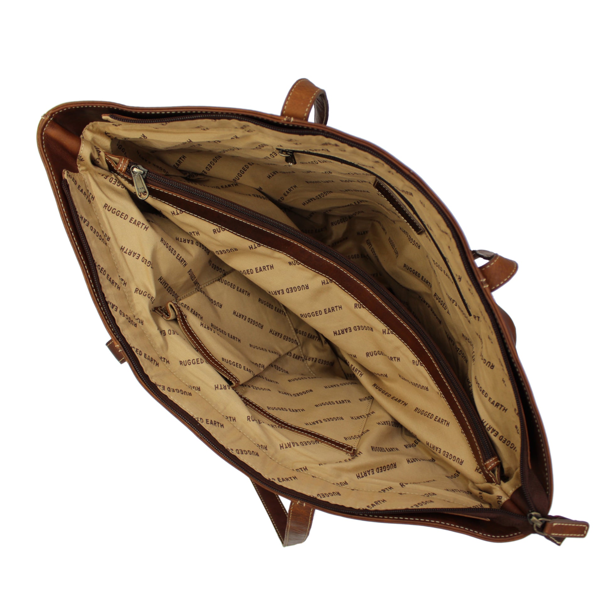 A flat bottomed leather bag by Rugged Earth. Features zippered main compartment with zippered divider pocket. Two open side pouches and one zippered side pocket. Two carrying handles. Made from genuine leather with fabric lining.