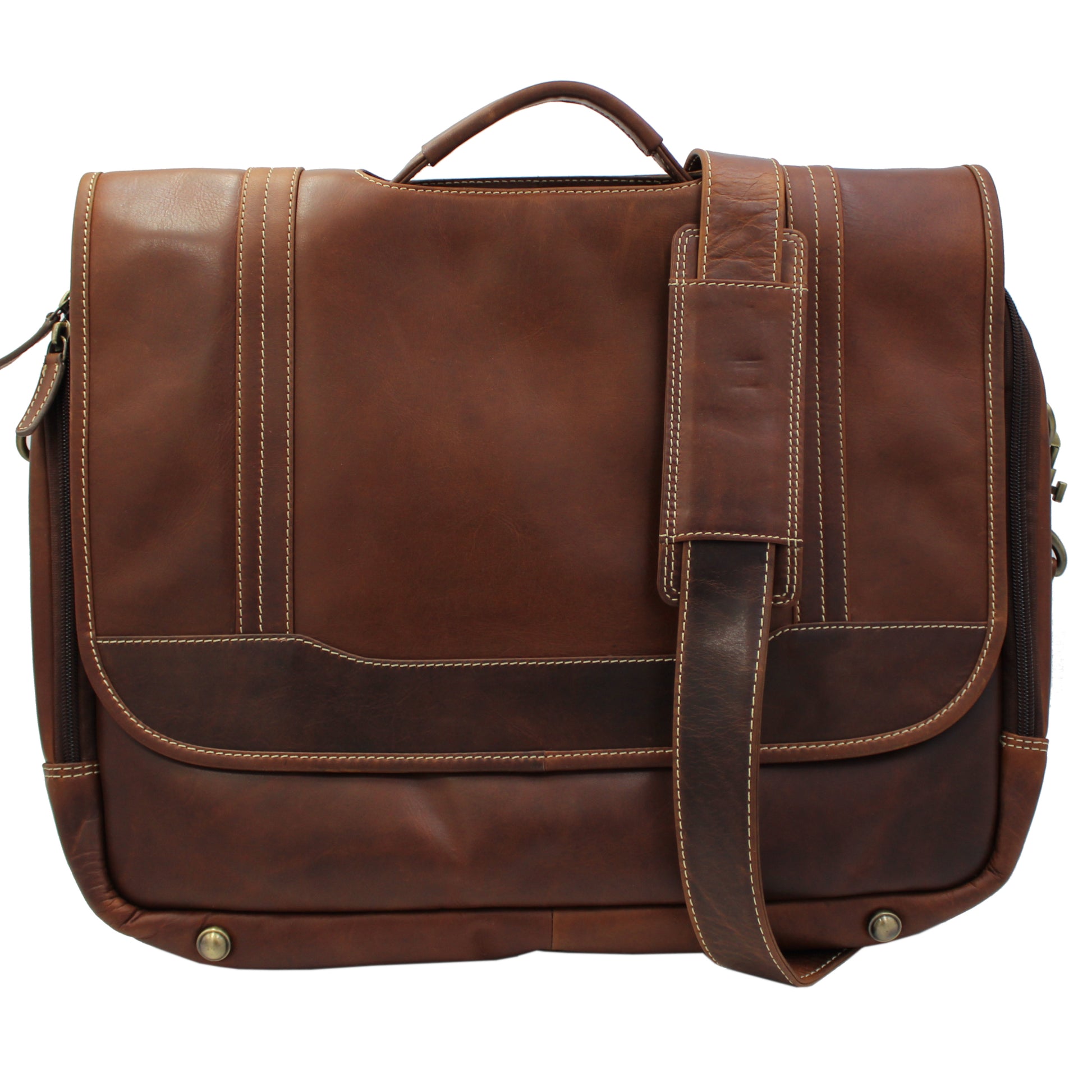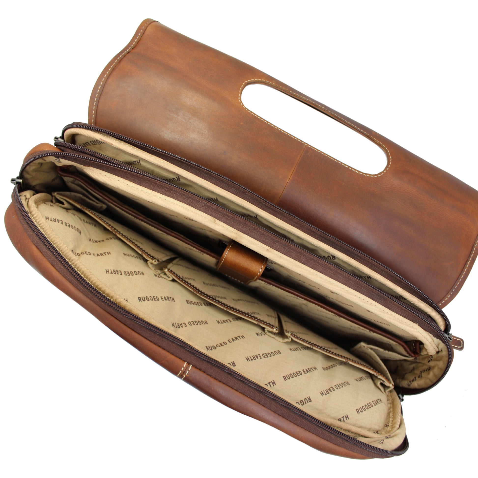 Rugged Earth leather bag great for carrying laptops or large books. Features front cover flap with two magnetic snap closures, one open front pocket, two double-zippered main compartments and one zippered back pocket. Front pocket contains zippered side pocket, one open phone pouch, three pen holders and four credit card slots. Front main compartment features open side pocket with velcro tab closure, and three open side pouches. Rear main compartment features a zippered side pocket. Leather carrying handle and detachable shoulder strap included. Shoulder strap is adjustable and approximately 150 cm (59") long. Made from genuine leather with fabric lining.