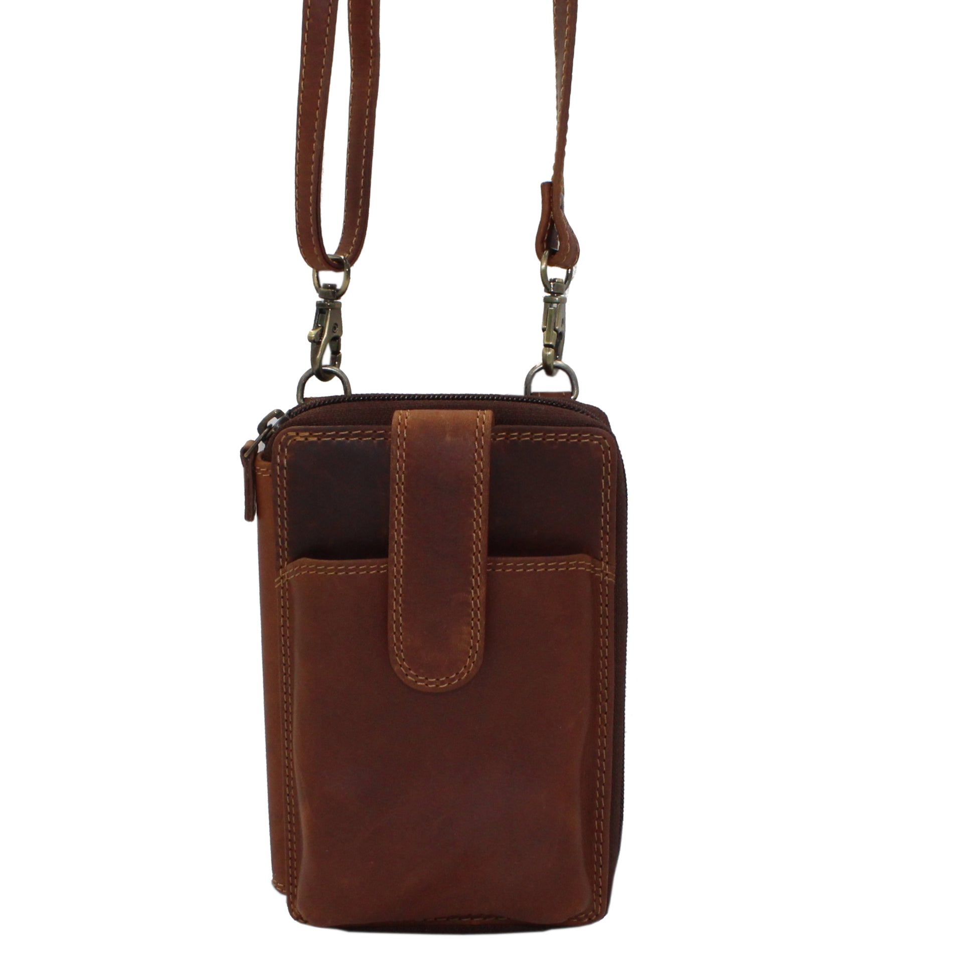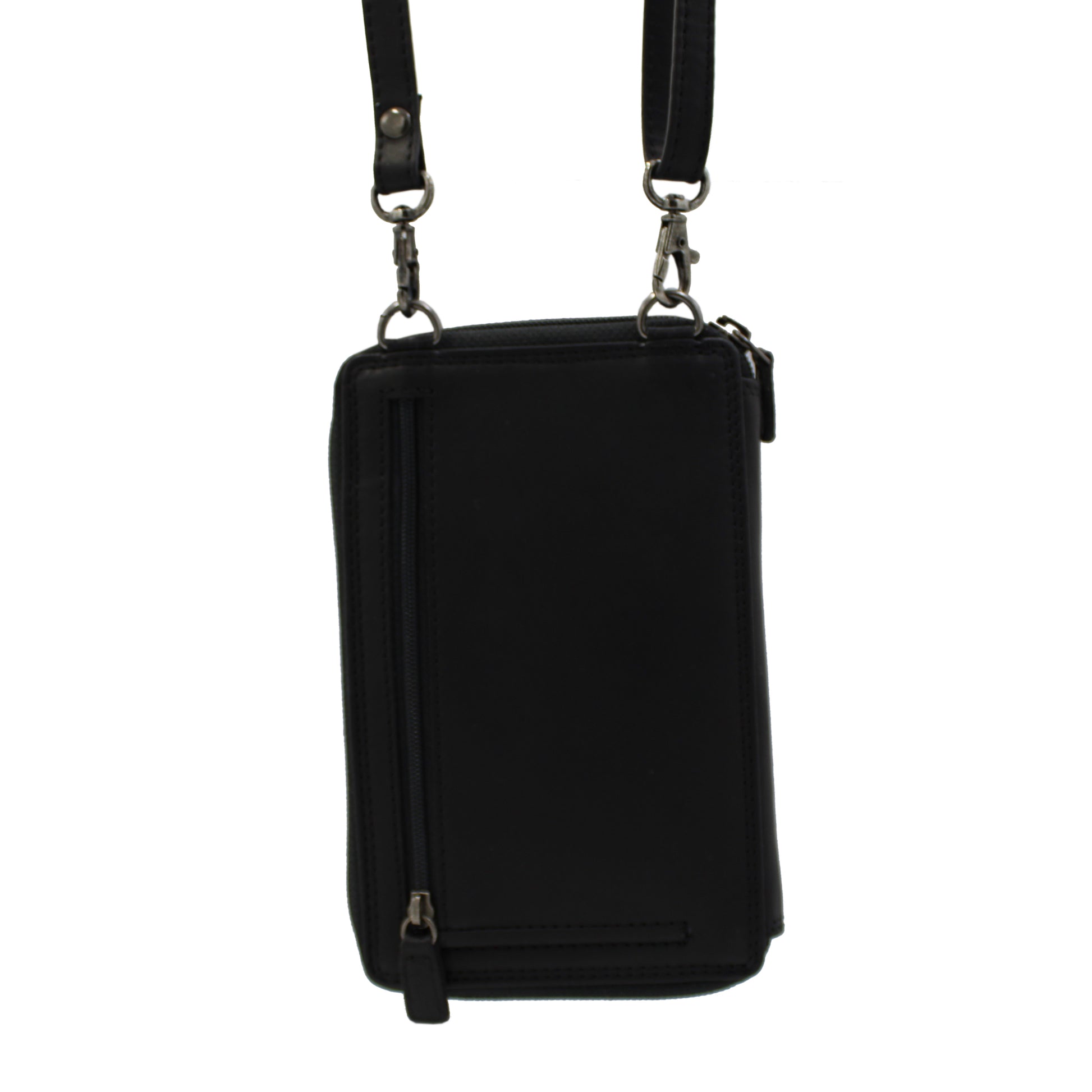 Rugged Earth leather clutch purse with zippered main compartment and open front pouch with magnetic snap closure. Features six credit card slots, two clear ID slots, one open pocket and one zippered pocket. Adjustable shoulder strap can be detached and is approximately 150 cm (59"). Detachable wrist strap also included. Made from genuine leather with fabric lining.