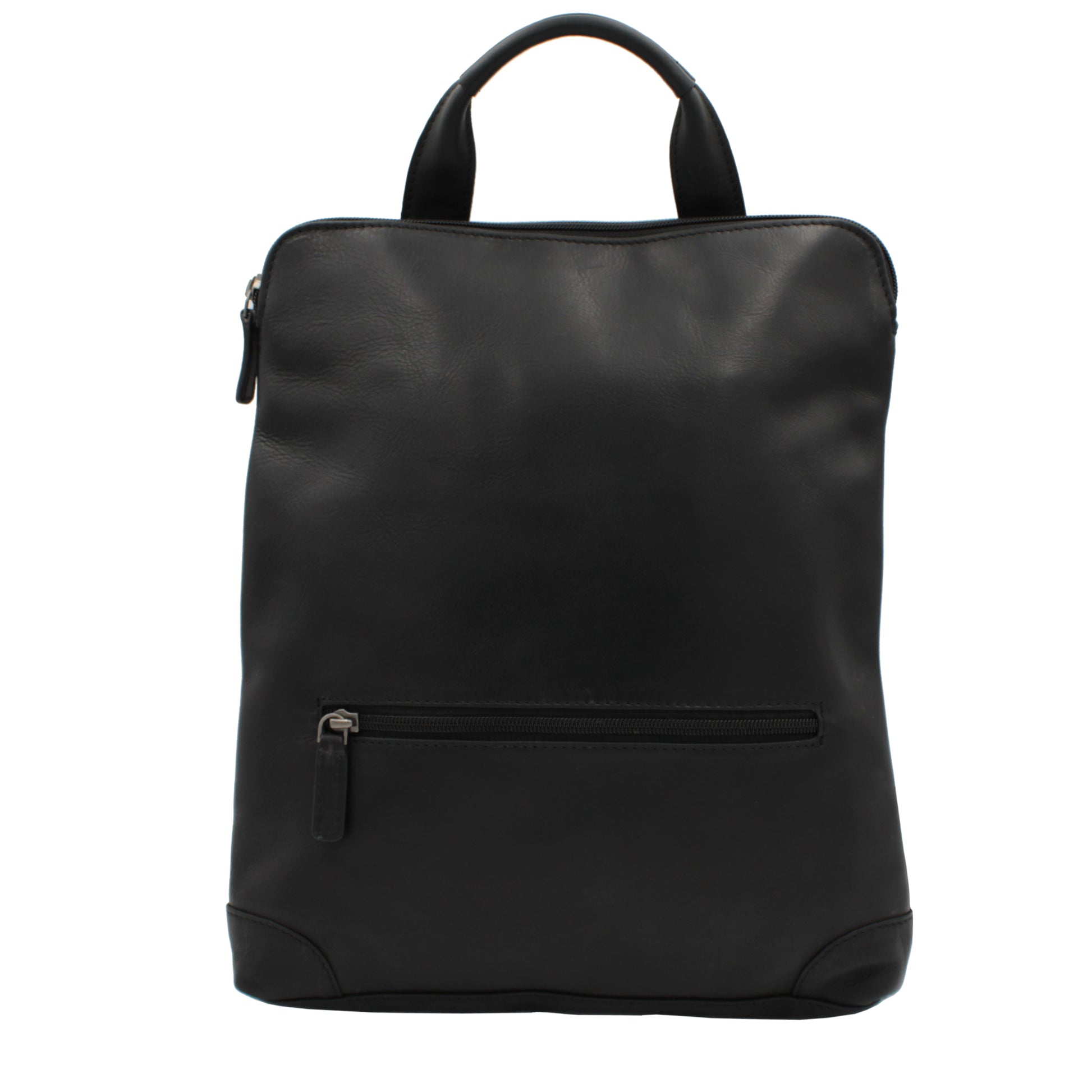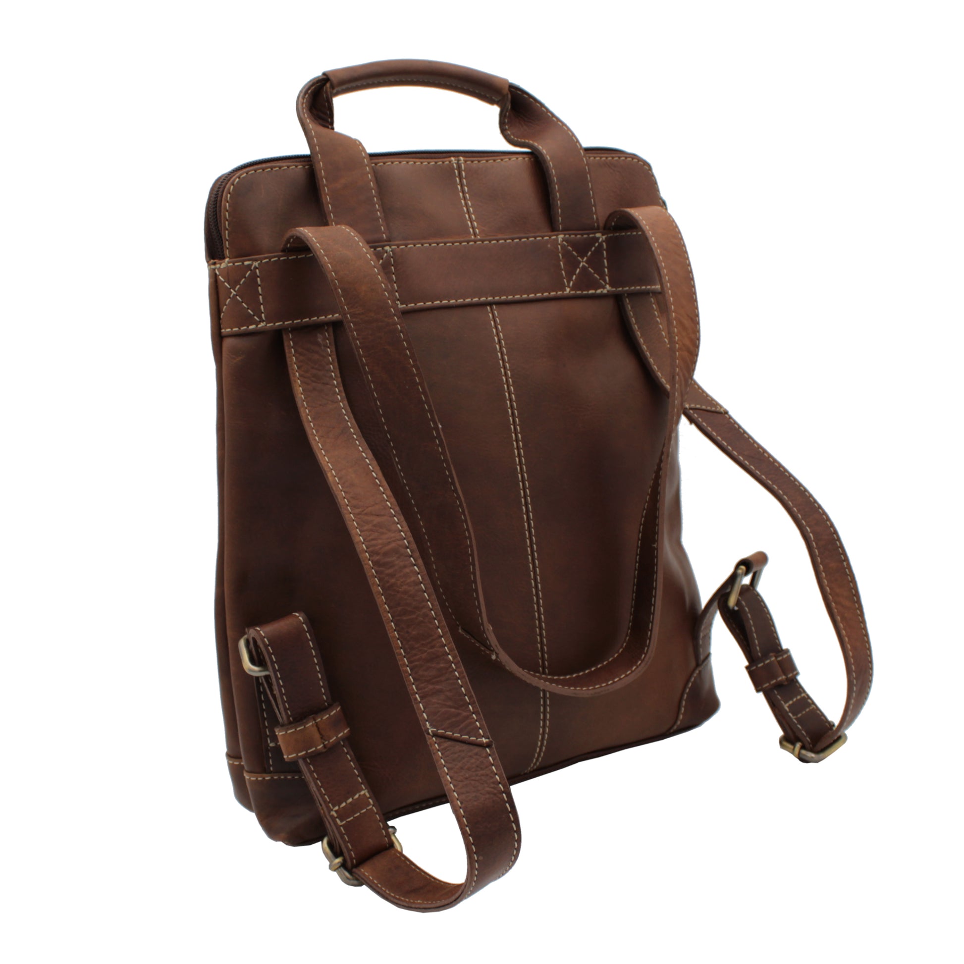 Rugged Earth leather bag. Features zippered front pocket and zippered main compartment. main compartment contains zippered inside pocket, cell phone pouch, two pen holders and a key ring. Features top carrying strap, as well as a strap that can covert from one over the shoulder strap to two backpack style straps. Adjustable strap is approximately 127cm (50") long. Genuine leather with fabric lining.