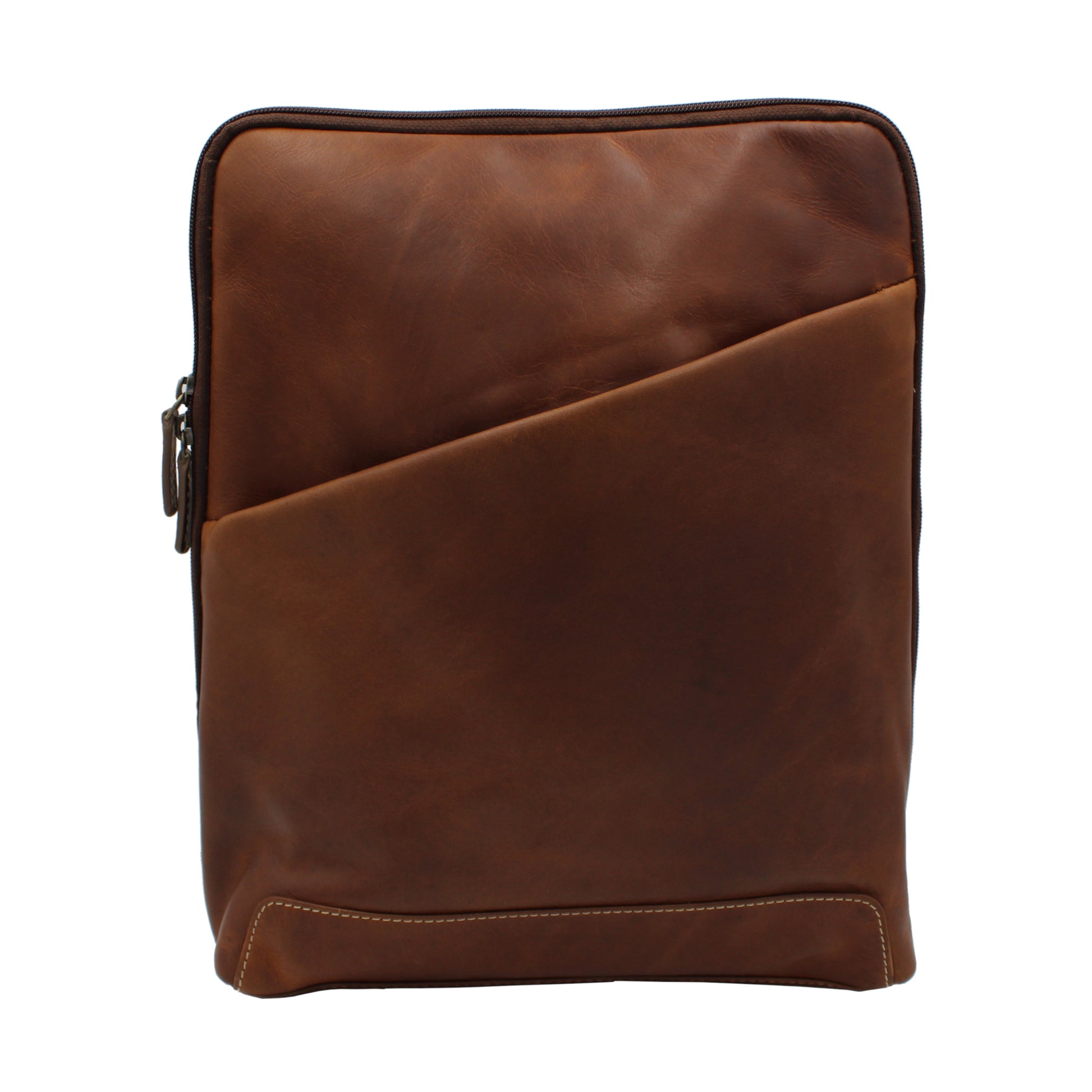Leather backpack from Rugged Earth with zip up shoulder straps and carrying handle. Includes a zippered front and back pocket, Zippered main compartment with accordian side insert contains open side pocket, cell phone pouch and two pen holders. Genuine leather with fabric lining.