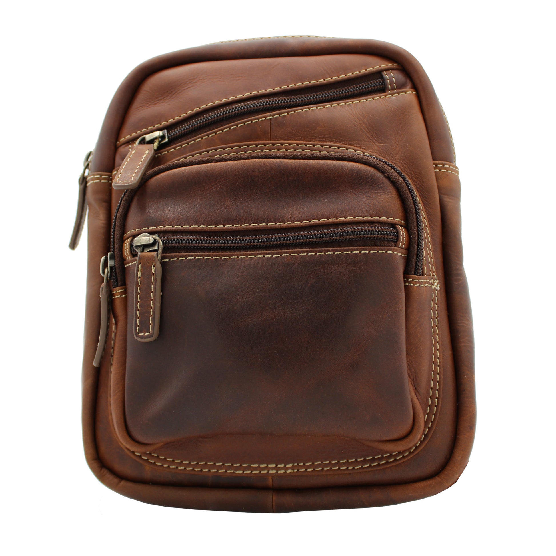 Rugged Earth leather backpack. Features three zippered front pockets, one rear zippered pocket and zippered main compartment. main compartment contains zippered inside pocket and cell phone pouch. Features top carrying strap, as well as a strap that can covert from one over the shoulder strap to two backpack style straps. Adjustable strap is approximately 127 cm (50") long. Genuine leather with fabric lining.