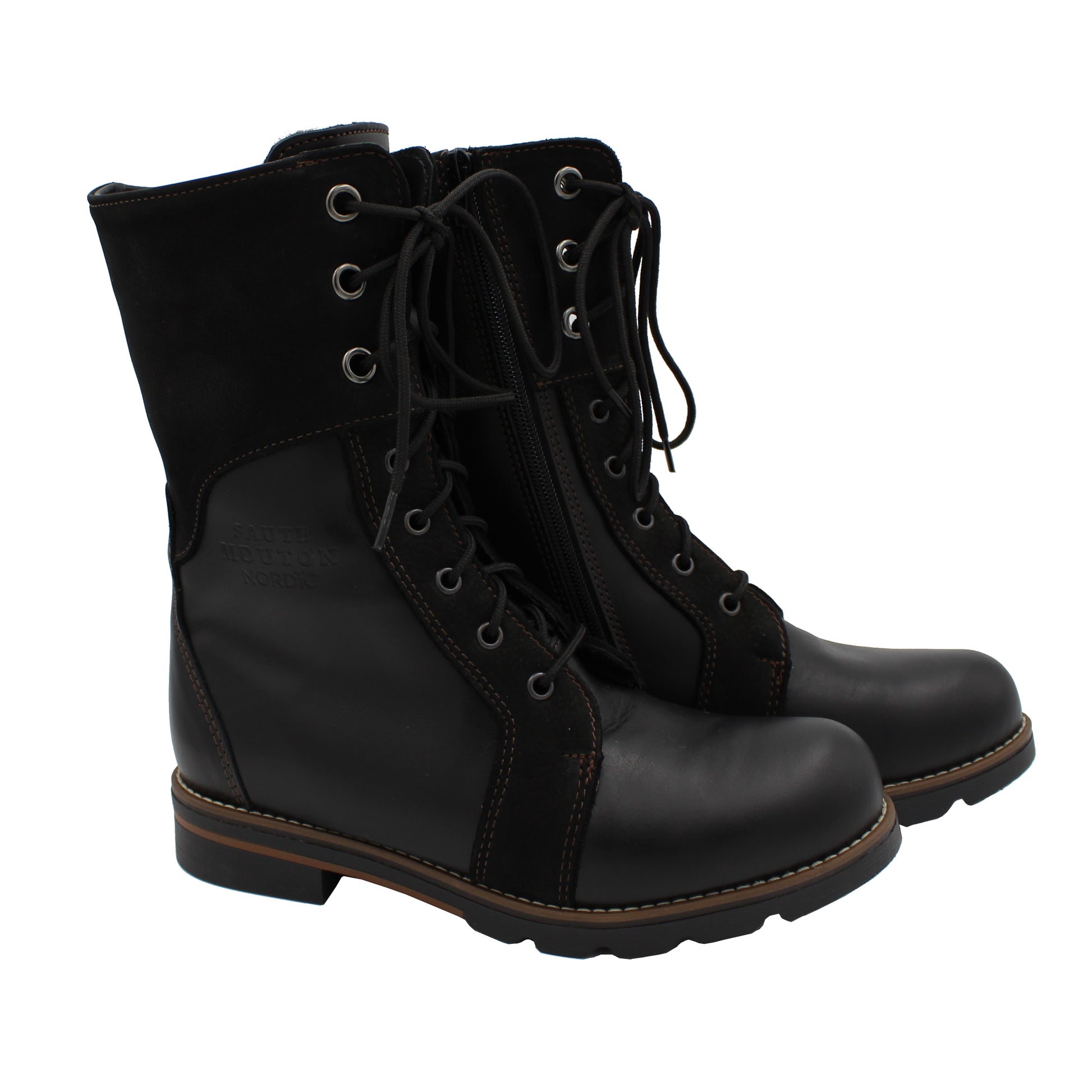 Women's mid-height lace-up boot with shearling lining and convenient side zipper. Watertight seams with multi-layered wool insoles. Smooth black leather with black nubuck trim. Approximately 22 cm (8 1/2") tall.