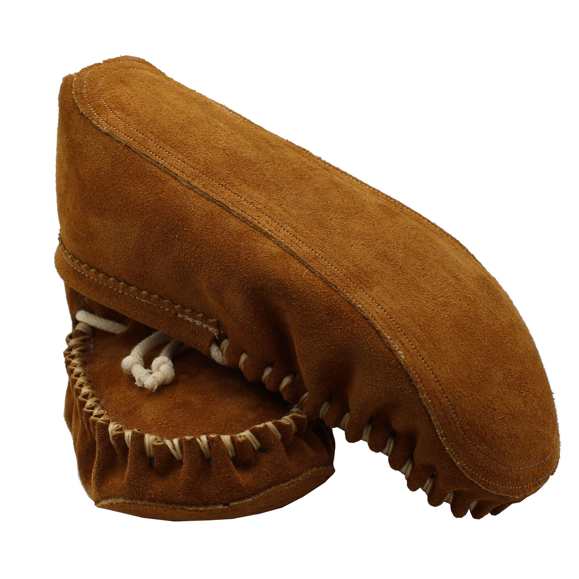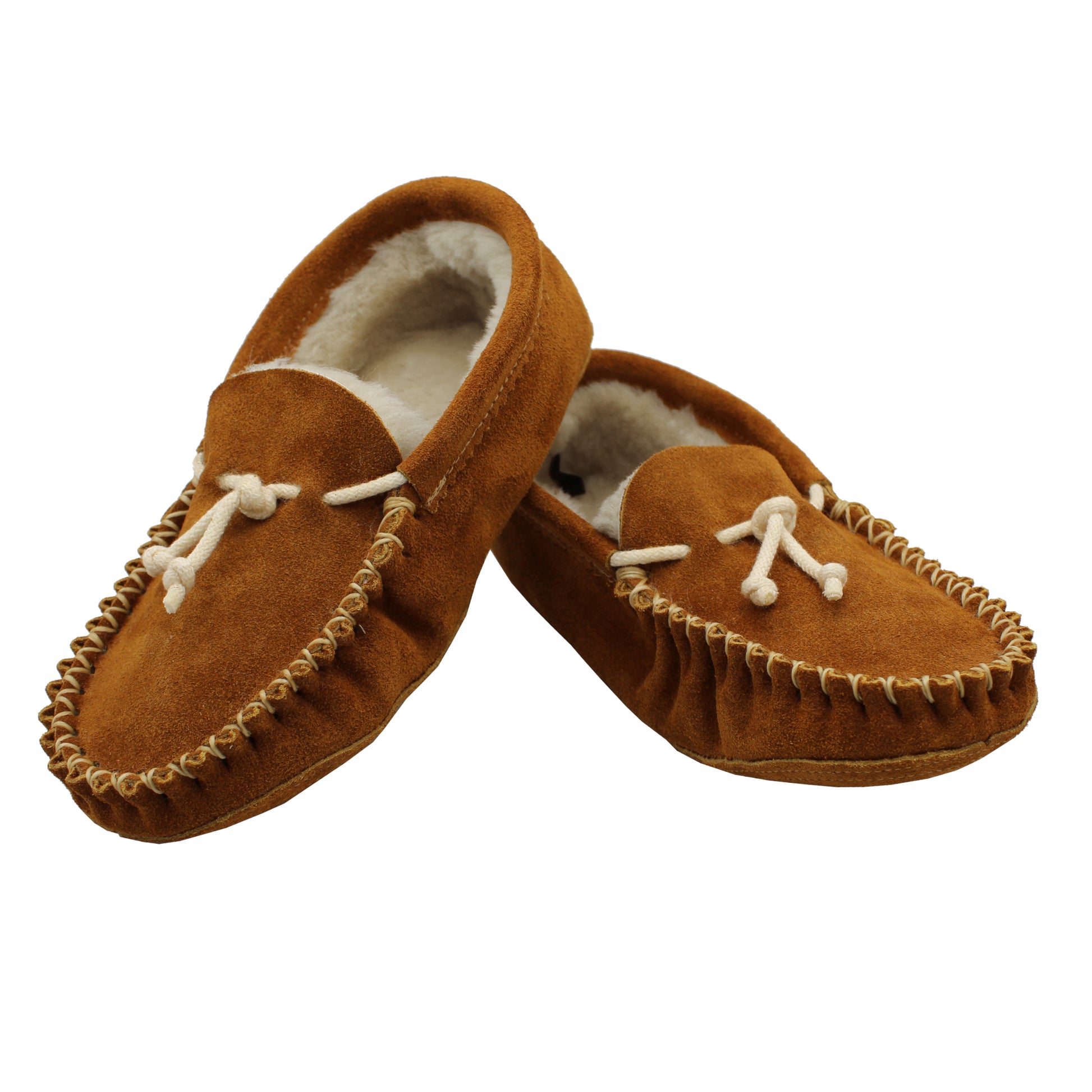 Made from genuine sheepskin for natural comfort. Suede leather outside with soft, dense shearling inside. Traditional moccasin styling with hand-lacing and decorative cotton cord ties. Medium width. For half sizes, we recommend going up to the next full size, the moccasins should have a snug fit when you first put them on.