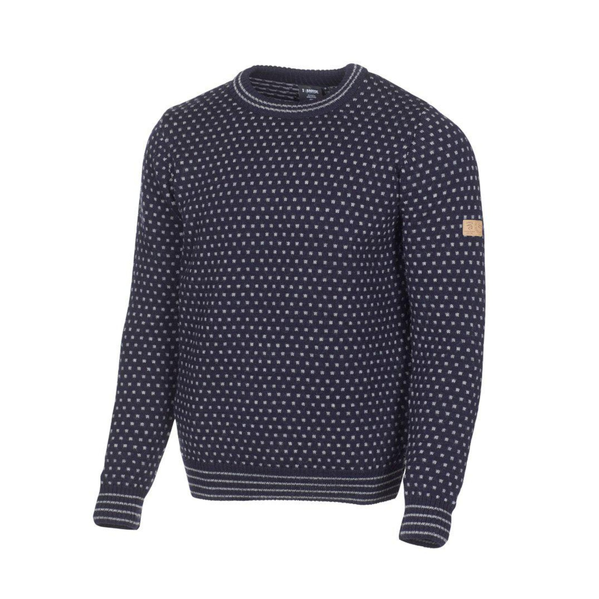 A timeless classic knit from 100% wool. Crewneck style with patterned knit and stripes on the neck cuff and at the ribbed cuffs at the bottom of the sleeves and body. Half-zip style also available here.