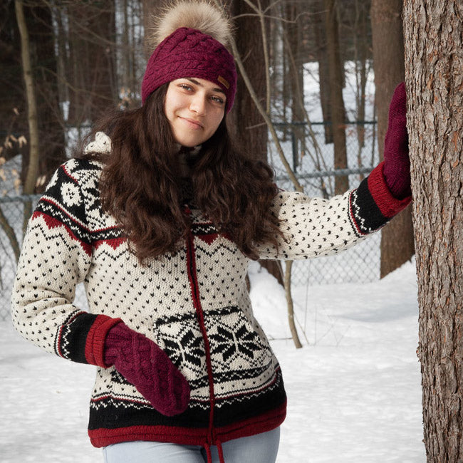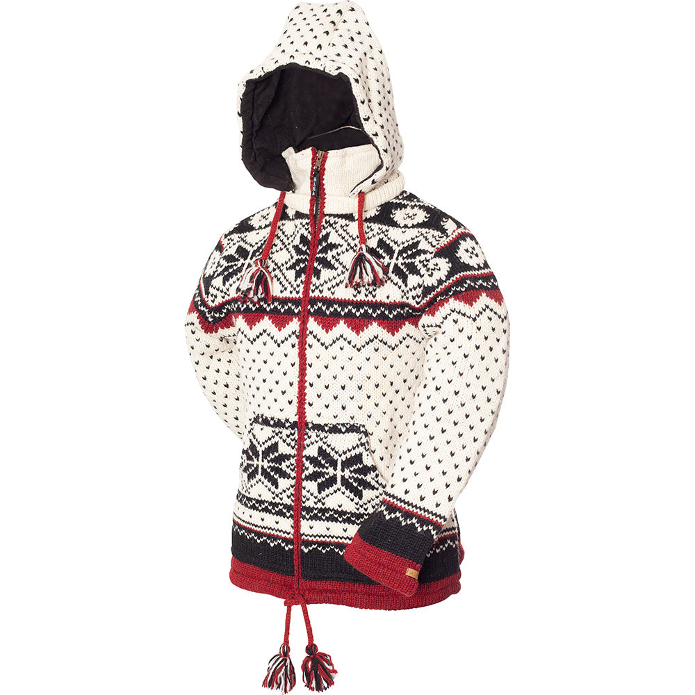Loose fit, zippered wool jacket with two side pockets and removable hood. Adjustable waist drawstring. Snowflake and dots pattern.