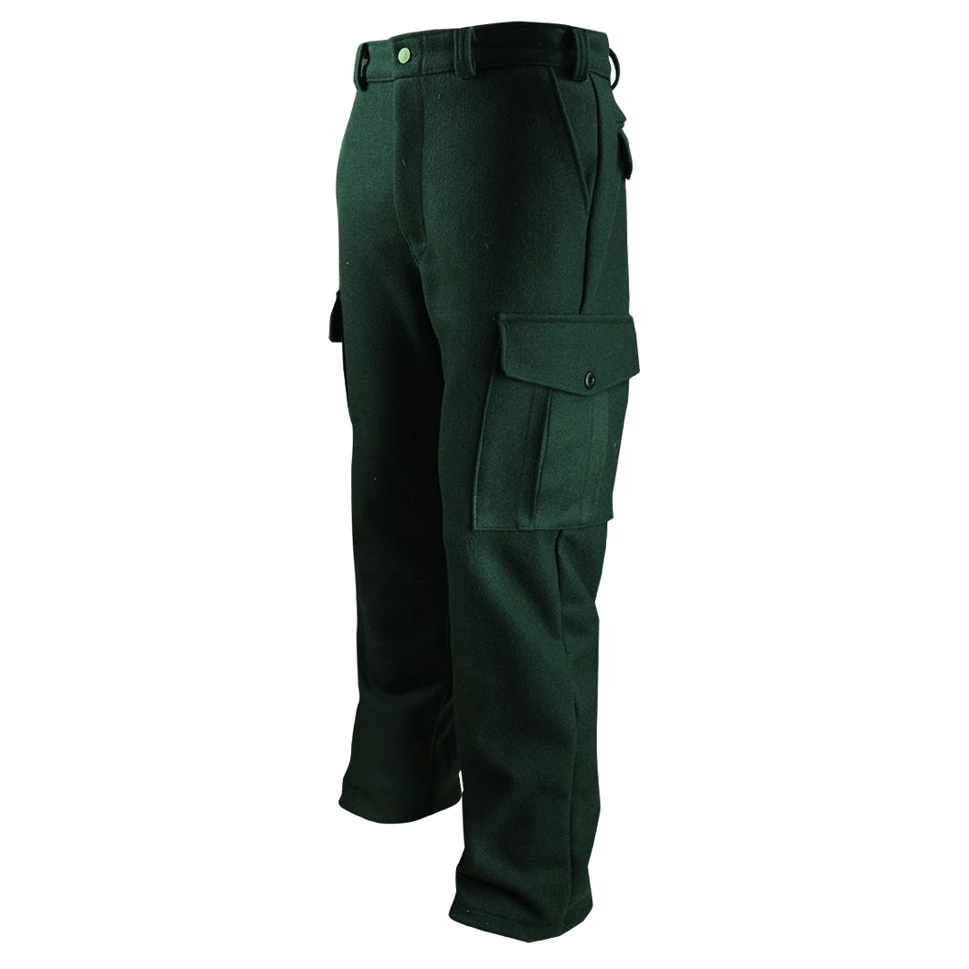 Cargo style pants made from 24 oz. 80% wool. Two hip pockets, two button/flap back pockets and two large cargo patch pockets with button/flap the legs. Waist band has suspender buttons. Inseam 33".