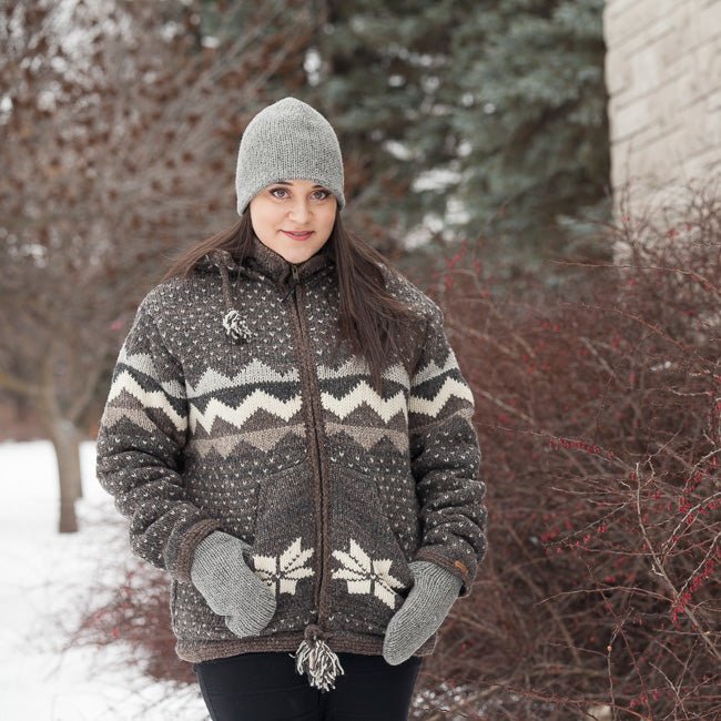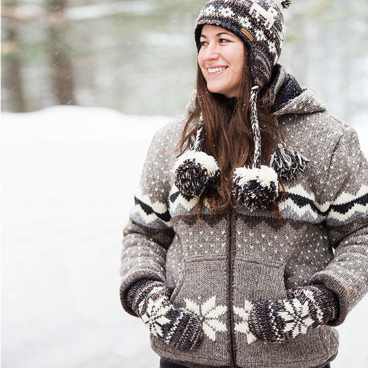 Loose fit, zippered wool jacket with two side pockets and removable hood. Adjustable waist drawstring. Snowflake design.