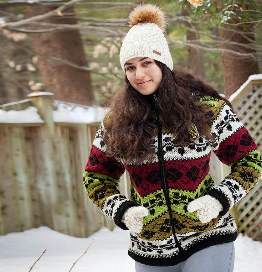 Loose fit, zippered wool jacket with two side pockets and removable hood. Adjustable waist drawstring. Multi-coloured pattern.
